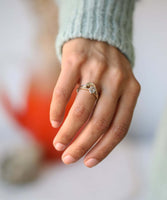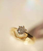 This solitaire features a unique round semi-translucent salt and pepper diamond set onto an elegant 6-prong setting with tiny pave diamonds.
