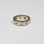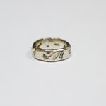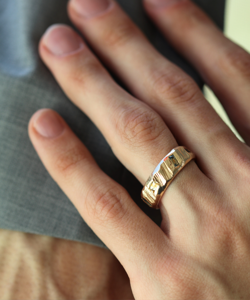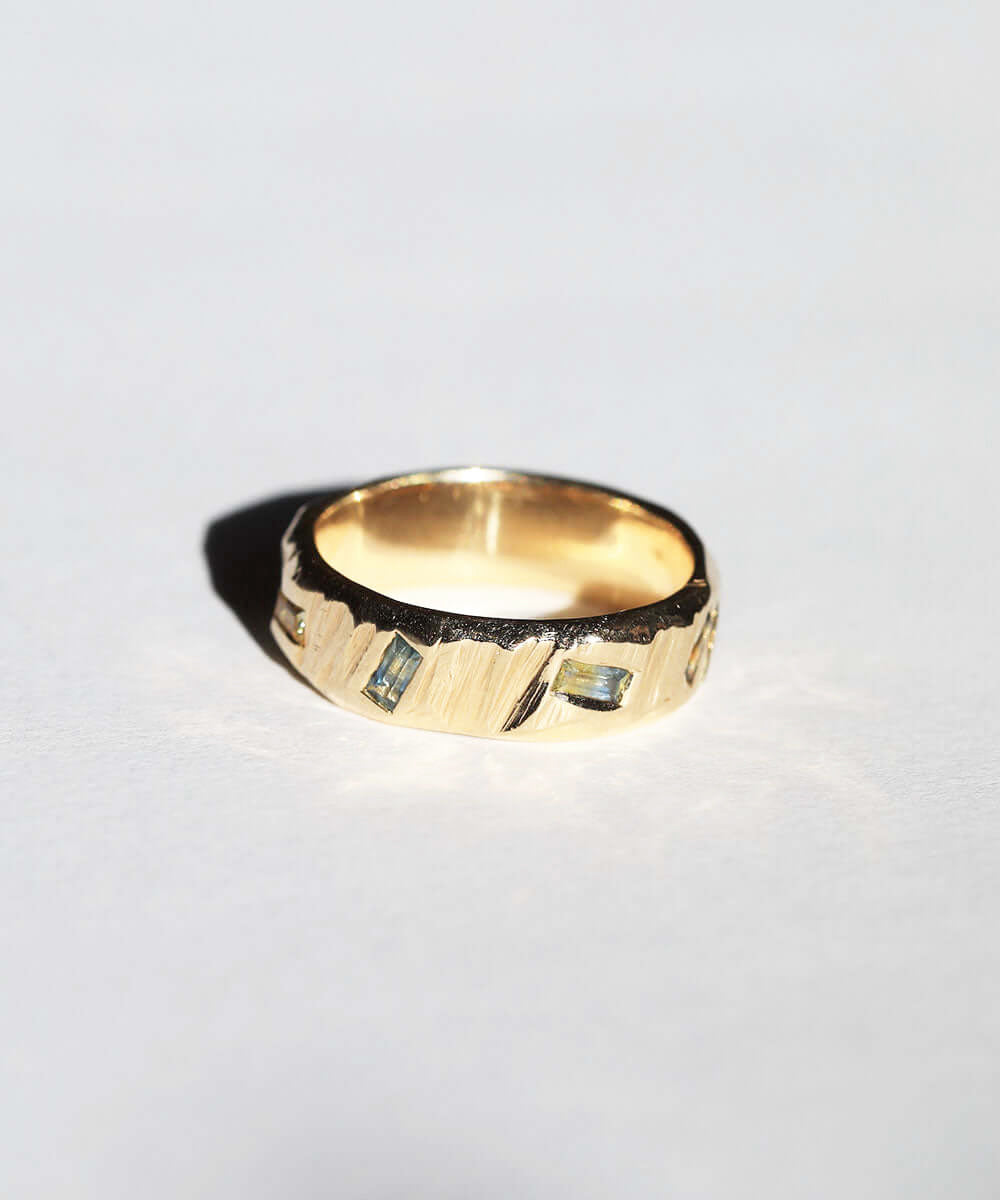 The Ragged series are organic versions of traditional wedding bands. The texture, originally created by accident, is carved on each ring individually so no two rings are ever the same. This piece is inlaid with bi-color montana sapphires.