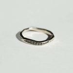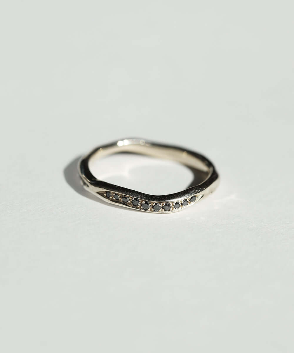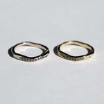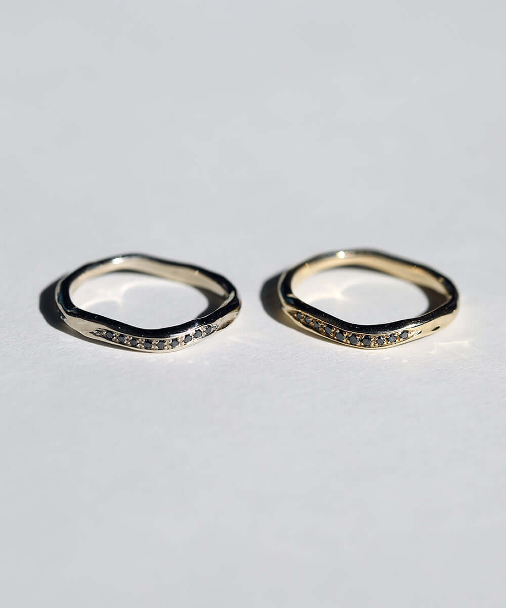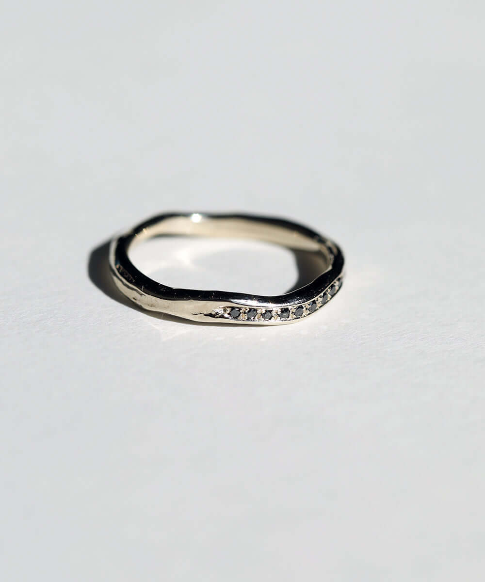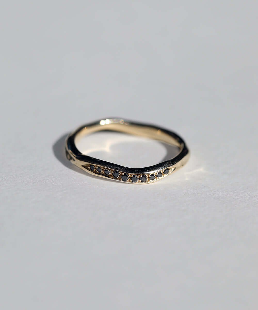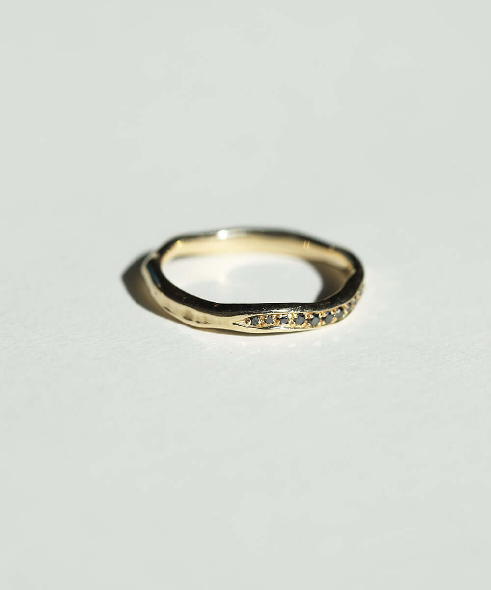 A natural uneven band inspired by organic forms and crafted in gold. Black diamonds are set across 1/3 of the band.