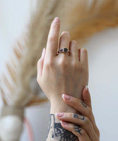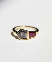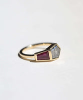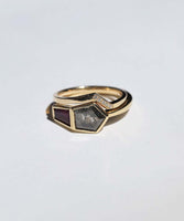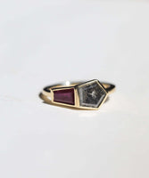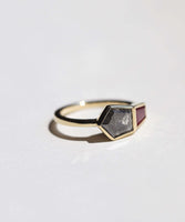 The Margot Dual Ring has both a ruby and a salt & pepper diamond in a 14k yellow gold setting.