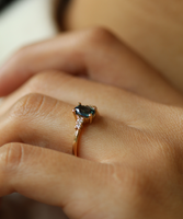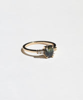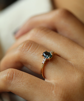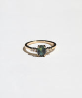 The Allie Sapphire ring features a teal colored Australian Sapphire in a 14k gold setting, with white diamond accents. Sits low to the finger. Sapphire is one of a kind.