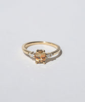 The Allie Sapphire ring features a unique orange colored Montana Sapphire in a 14k gold setting, with white diamond accents. Sits low to the finger. Sapphire is one of a kind.