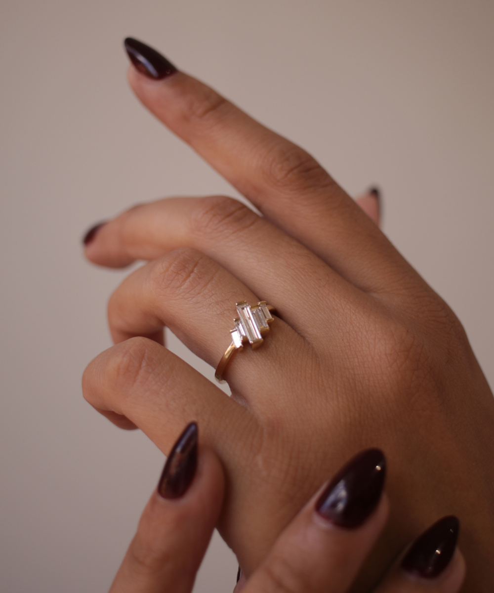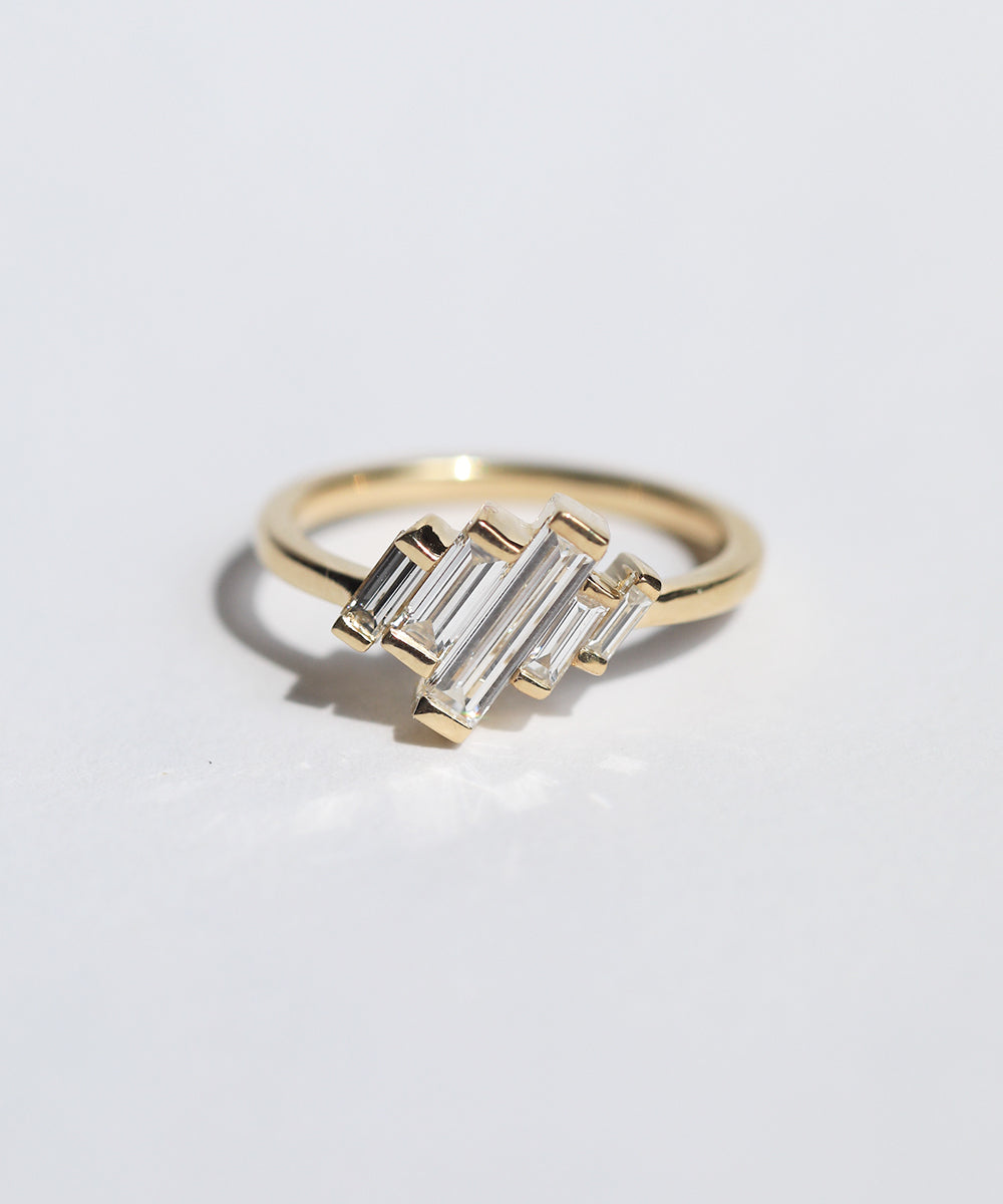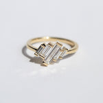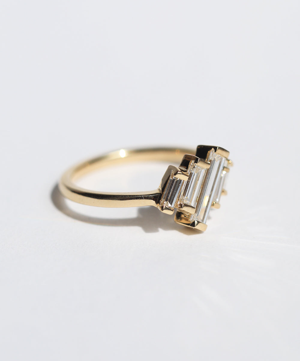 Natural white baguette diamonds set asymmetrically in 14k yellow gold.