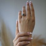 The Layla solitaire has an immaculate salt & pepper oval shaped diamond set in a custom made 14k gold setting with white diamond accents. Sits low to the finger. Diamond is one of a kind.