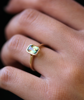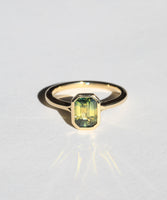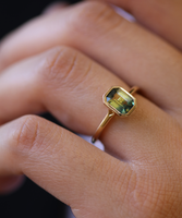 Specifications: 1.57ct bi-color green and yellow emerald cut Australian sapphire, in 14k yellow gold.