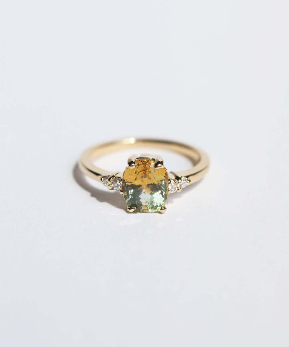 Orange bi-color sapphire on a 14k yellow gold band with diamond accents.
