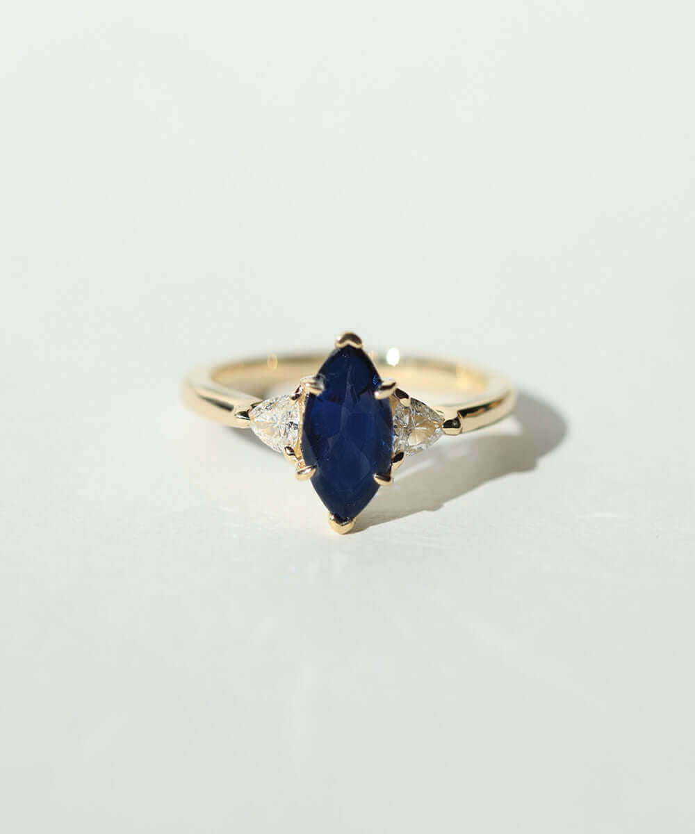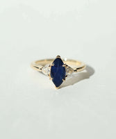 A marquise shaped blue sapphire, with diamond trillions set in 14k yellow gold