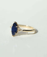 Specifications: 1.3ct dark blue sapphire 10mm tall, approx 0.3ct trillion diamonds in recycled 14k gold. Please note each sapphire is one of a kind.