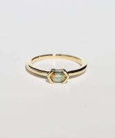 Specifications: 0.64ct hexagonal bi-color Montana Sapphire on 14k yellow gold, 1.5 mm band with modified bezel setting.