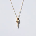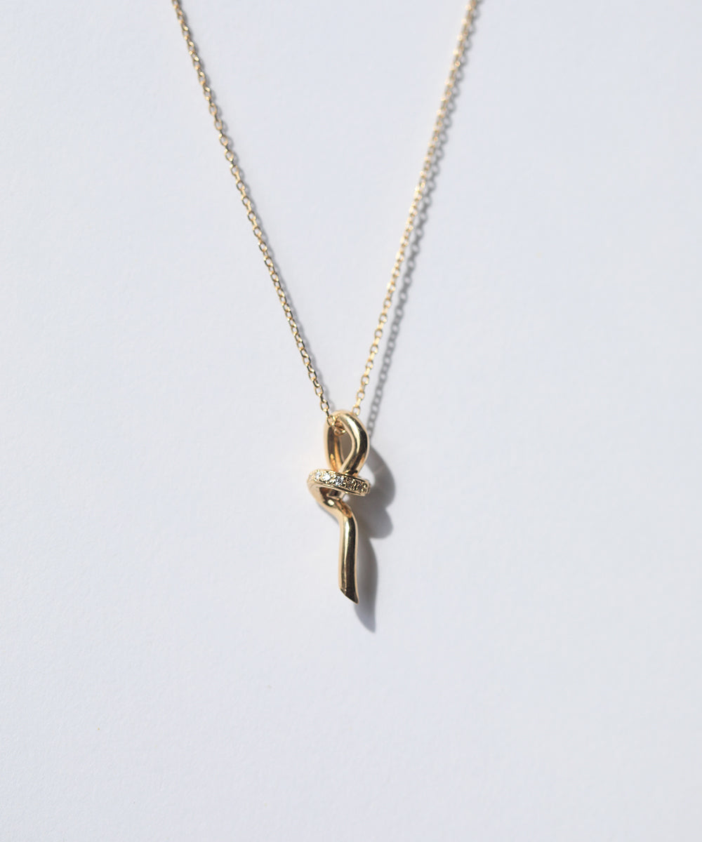 A loose knot pendant hangs from a hinged drop earring in 14k gold with pavé set diamonds.
