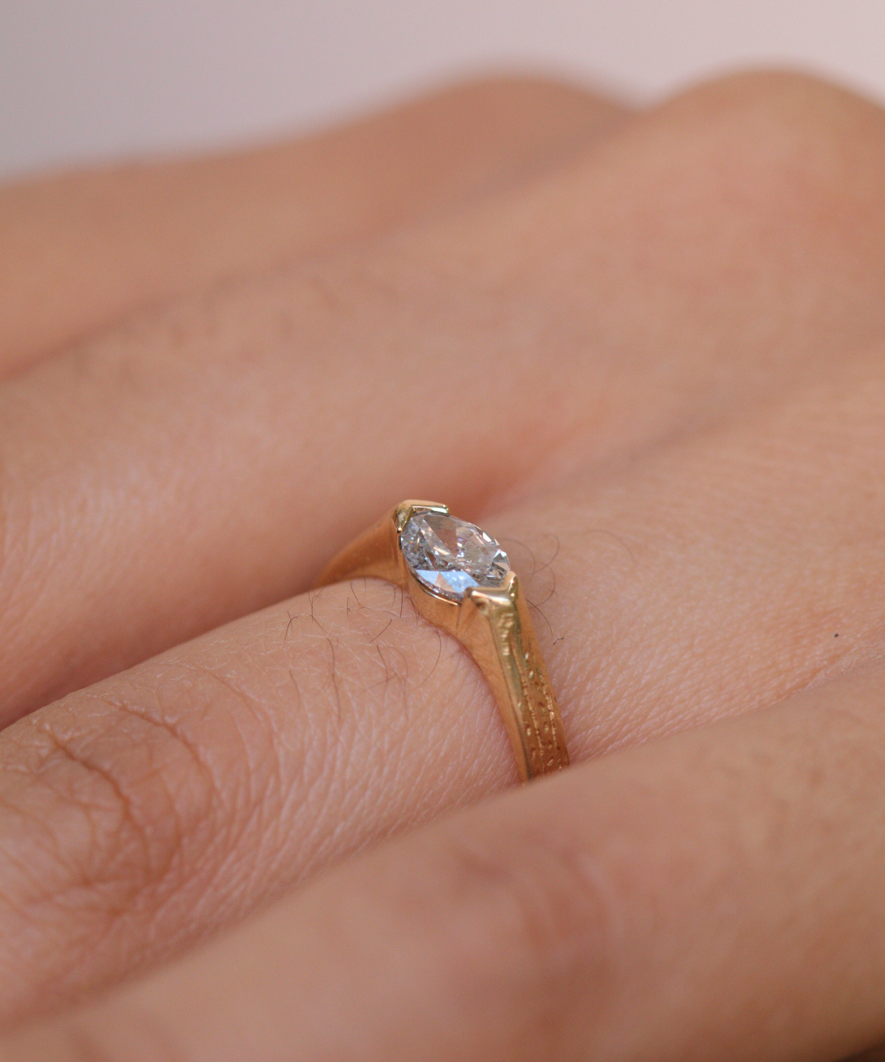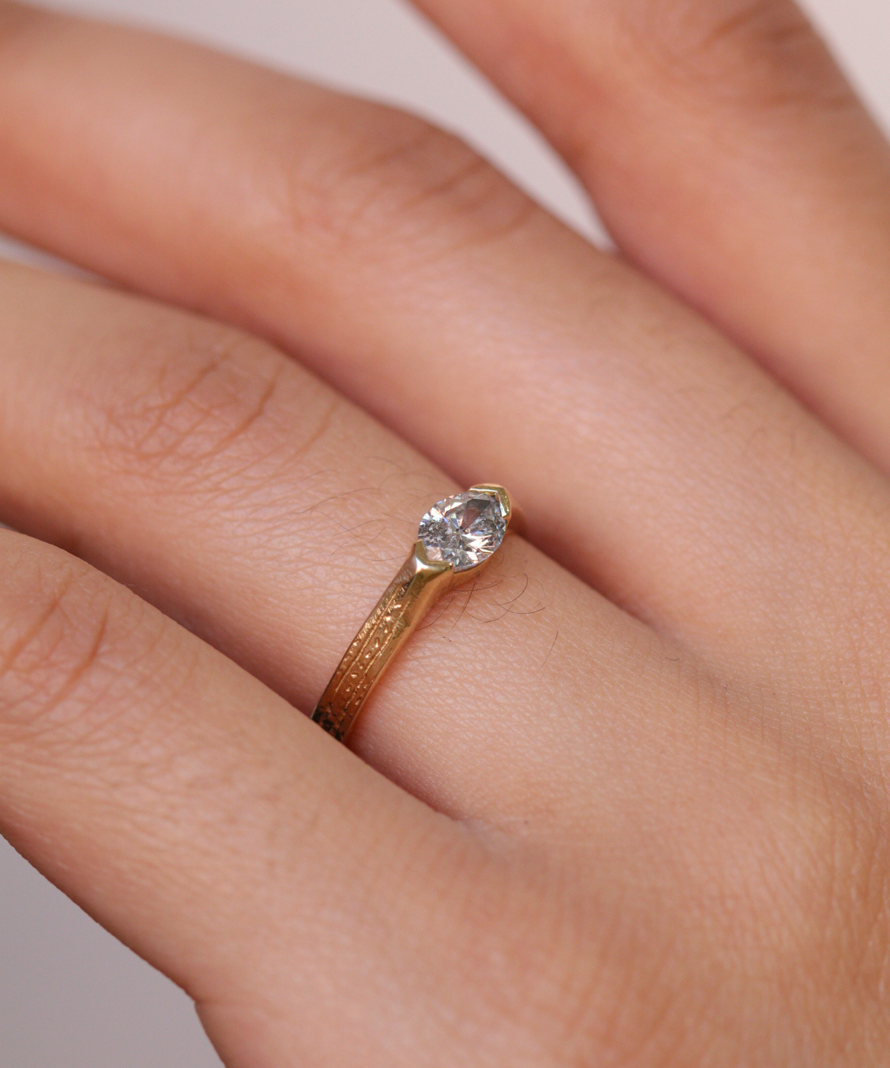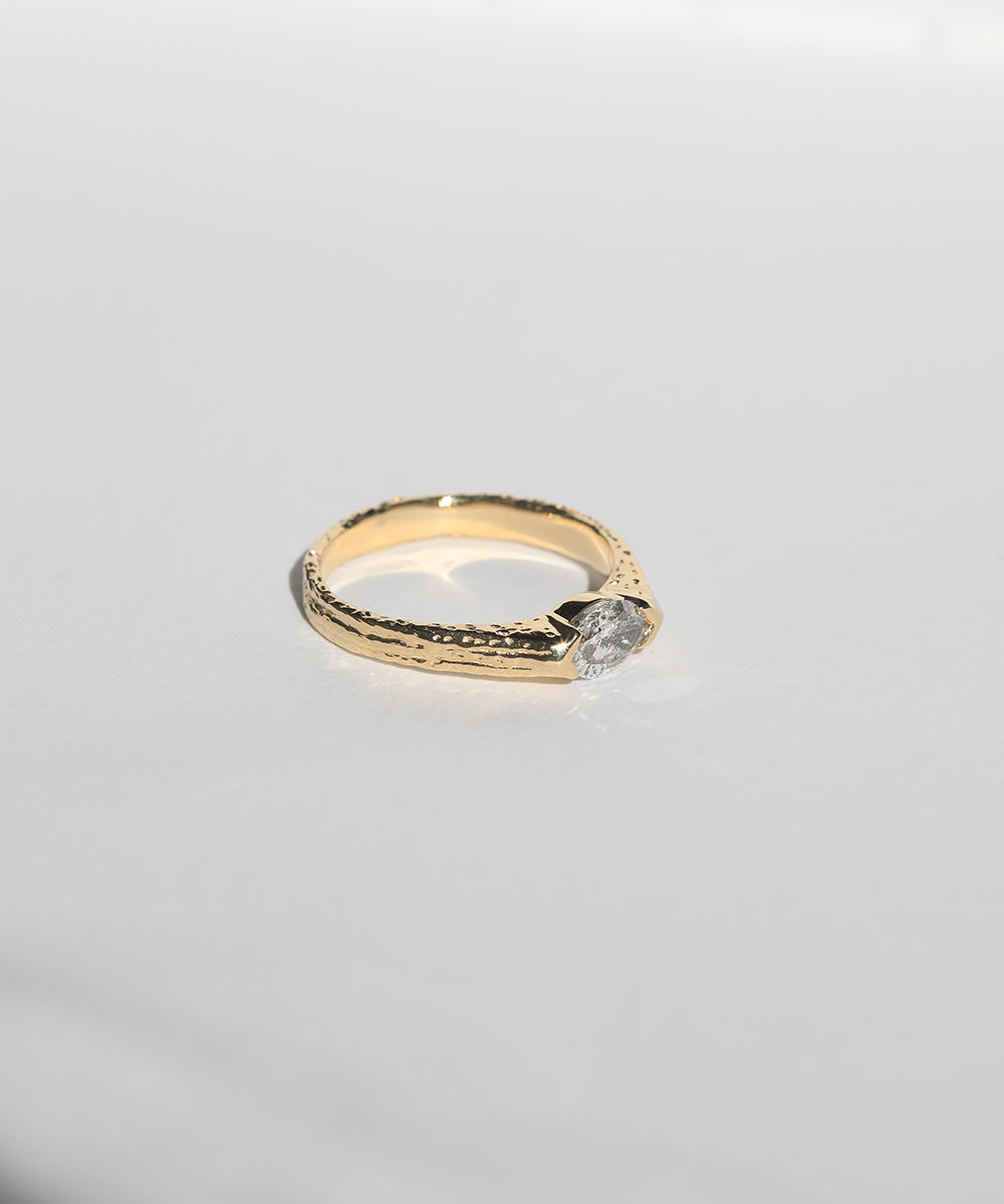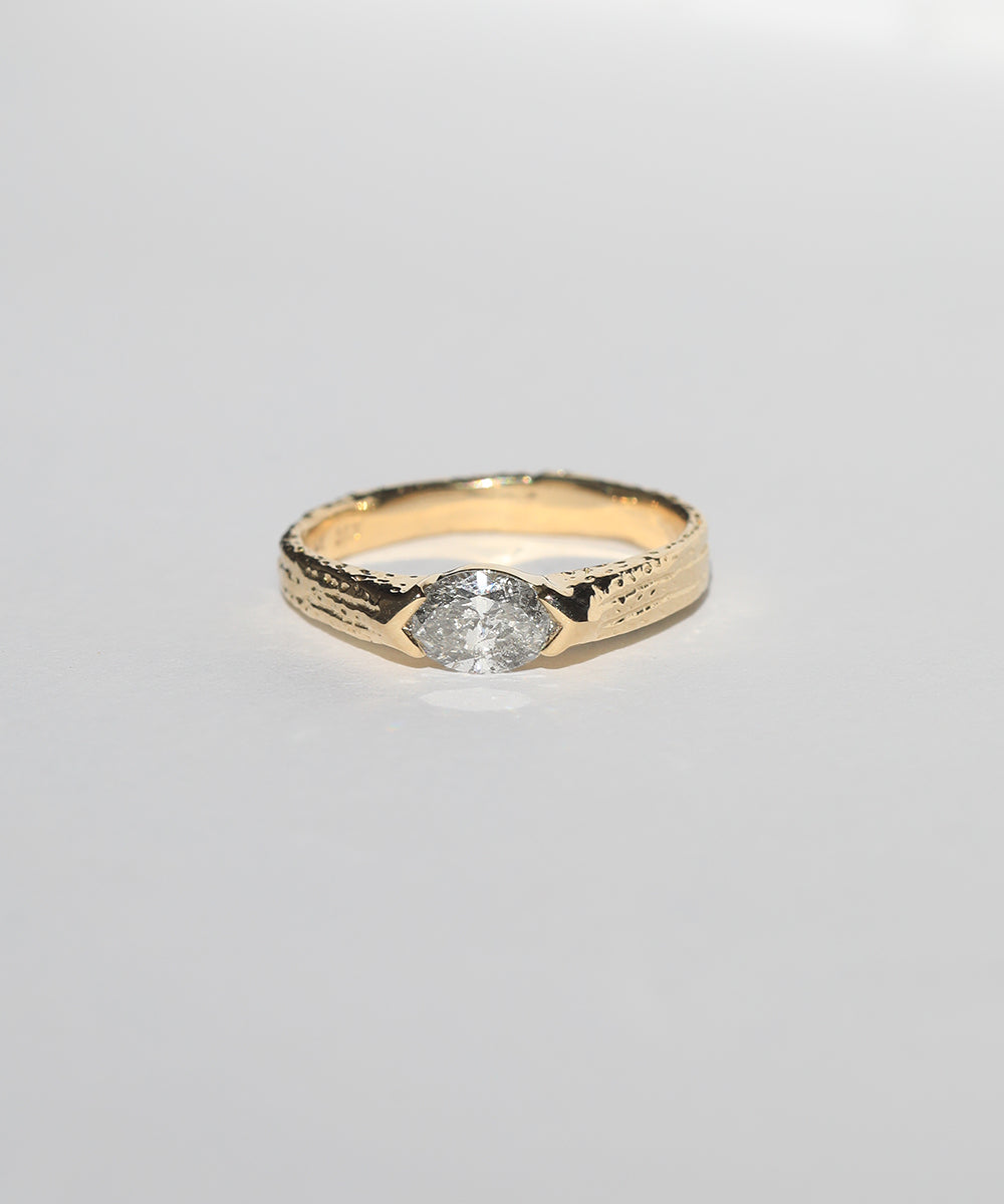 A Salt & Pepper marquise shaped diamond set onto a textural band with an ancient bohemian feel. View more of our foxtail collection here.