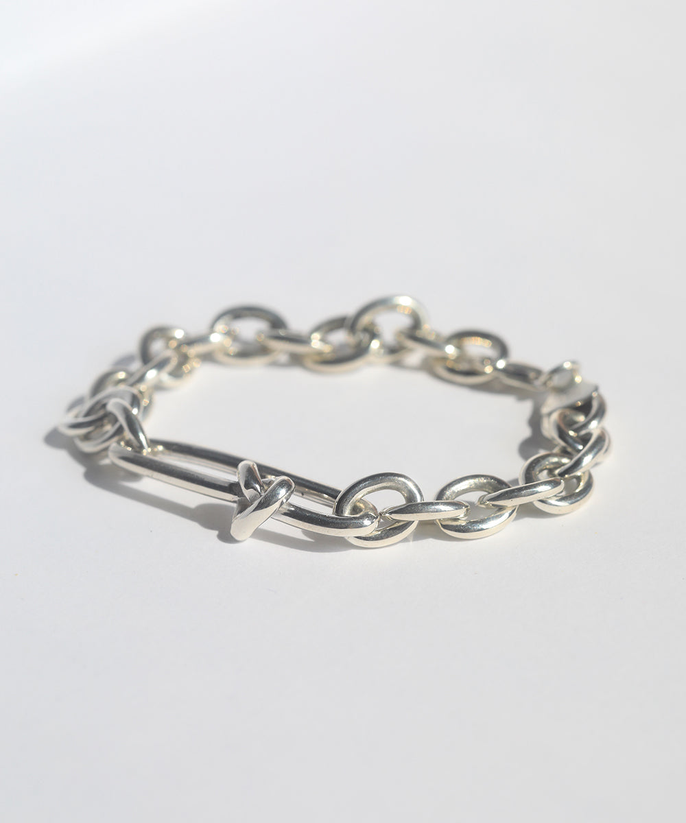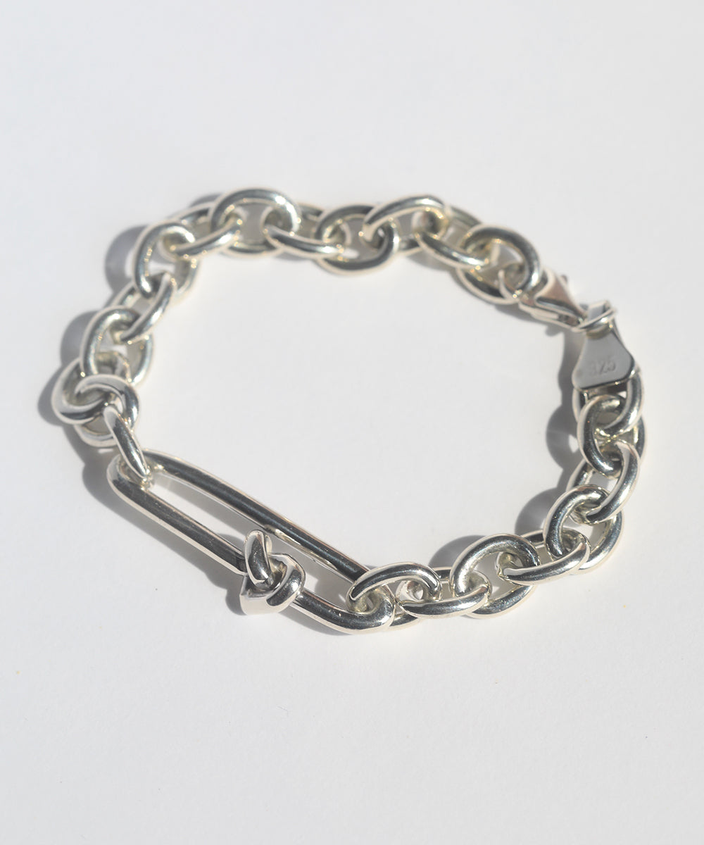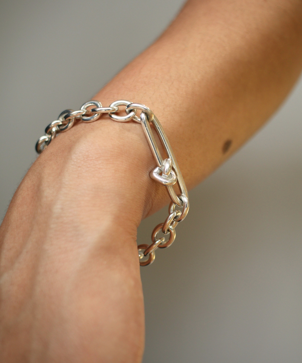 Heavy weight bracelet with heart shaped knot feature.