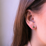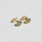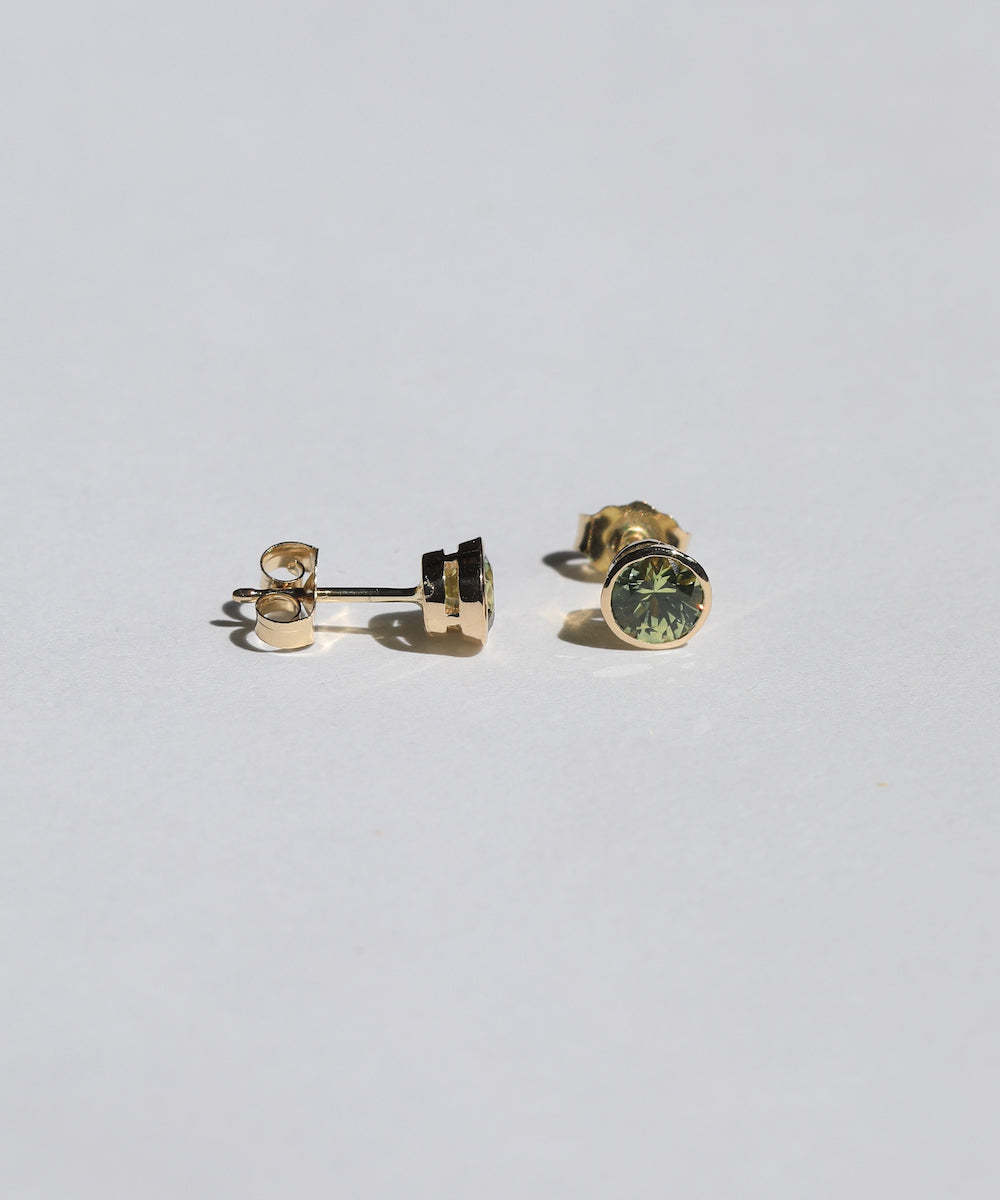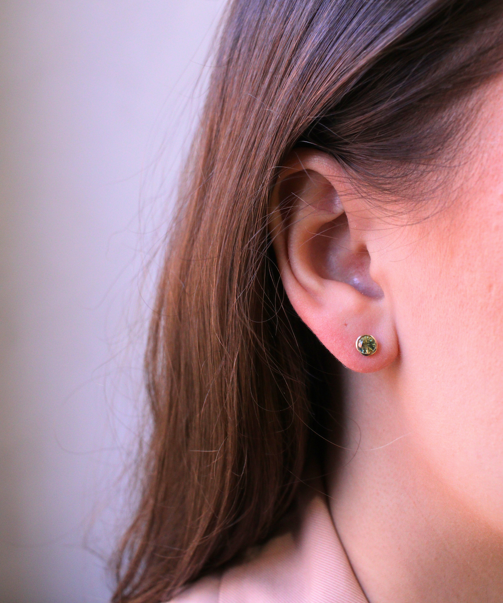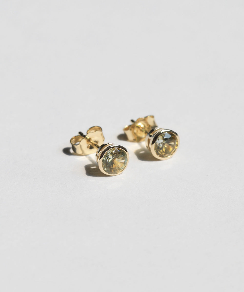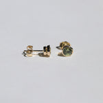 Bi-color sapphire stud earrings set in a 14k gold bezel setting.