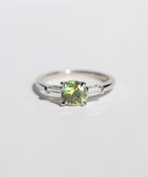 The Mila features a unique round Australian bi-color sapphire accented by white tapered baguettes