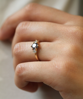 This three stone engagement ring has a round cut salt & pepper diamond, highlighted by two round accent diamonds on either side. Sits low to the finger.