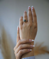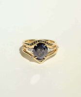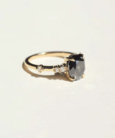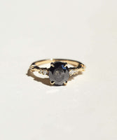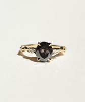 The Layla solitaire has an immaculate salt & pepper oval shaped diamond set in a custom made 14k gold setting with white diamond accents. Sits low to the finger. Diamond is one of a kind.