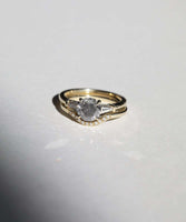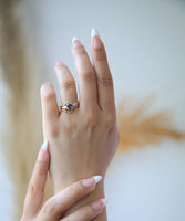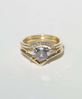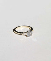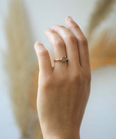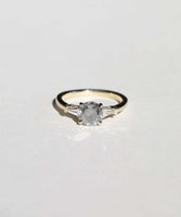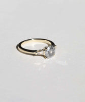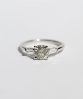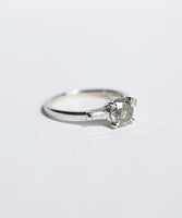 The Mila features a unique semi-translucent round cut salt & pepper diamond accented by white tapered baguettes