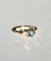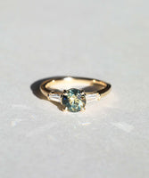 The Mila features a unique round Australian bi-color sapphire accented by white tapered baguettes
