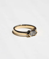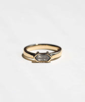 Specifications: 0.70ct diamond elongated hexagon salt & pepper diamond on 14k yellow gold, 3 mm band with modified bezel setting.