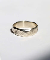 The Ragged Series are organic versions of traditional wedding bands. The texture, originally created by accident, is carved on each ring individually so no two rings are ever the same