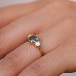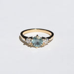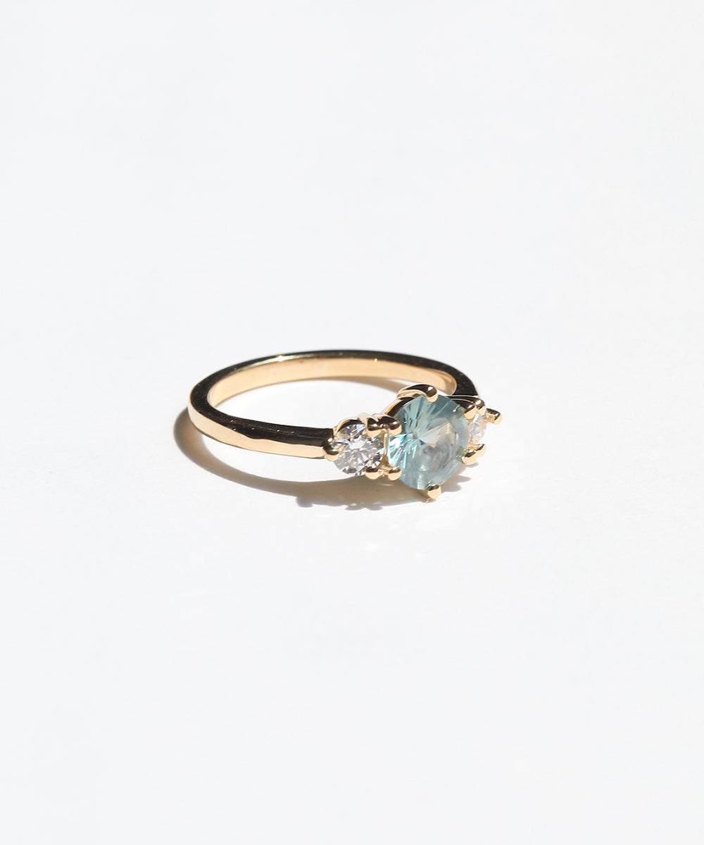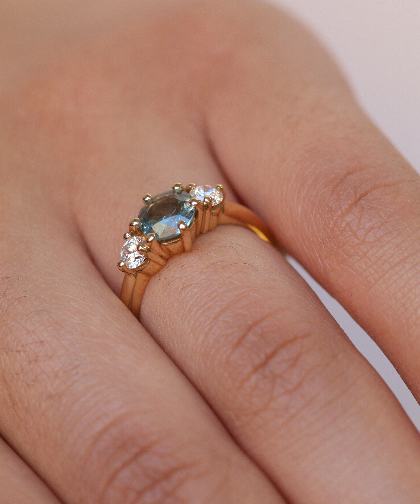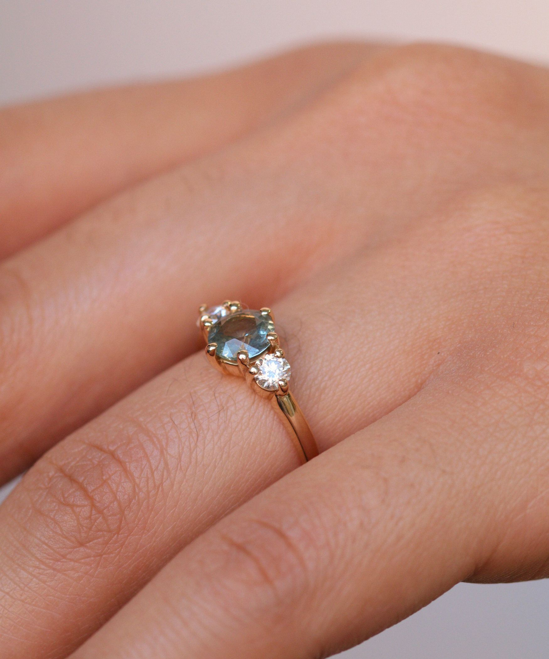 Specifications: 1.05ct Blue green natural montana sapphire, 0.33ct (3.5mm) natural VS reclaimed white diamonds. 1.5mm recycled 14k gold band.