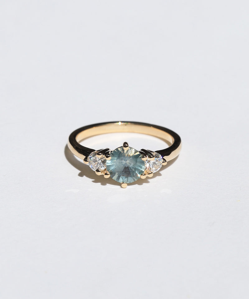 This three stone engagement ring features a unique round cut sapphire, highlighted by two round diamonds on either side. Sits low to the finger.