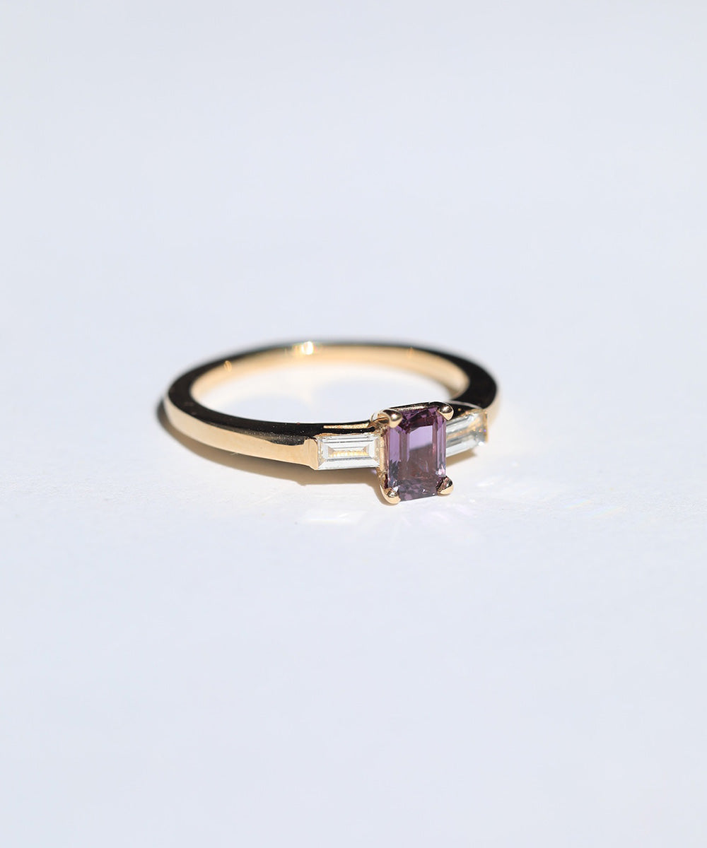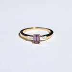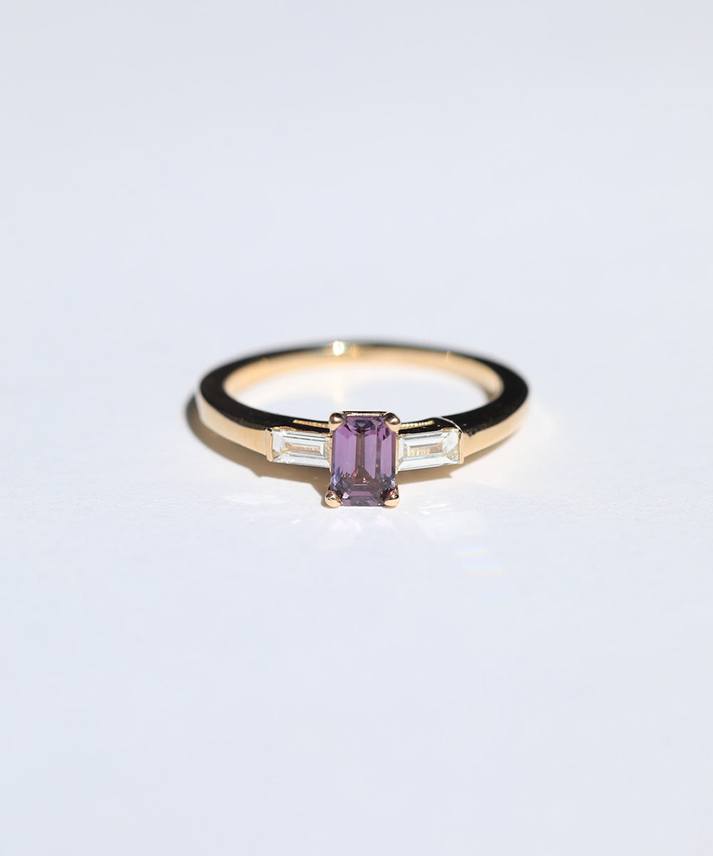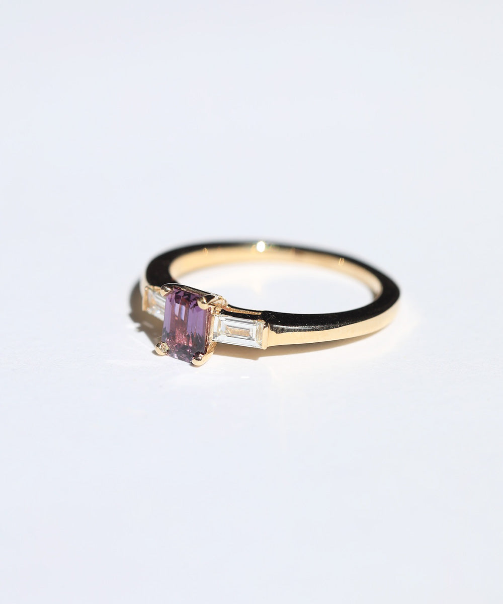Specifications: Approx 0.75ct emerald cut purple sapphire (6x4mm), approx 0.2ct reclaimed VS white baguette diamonds, 14k gold. 1.5mm band.