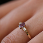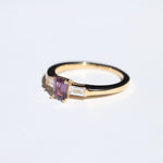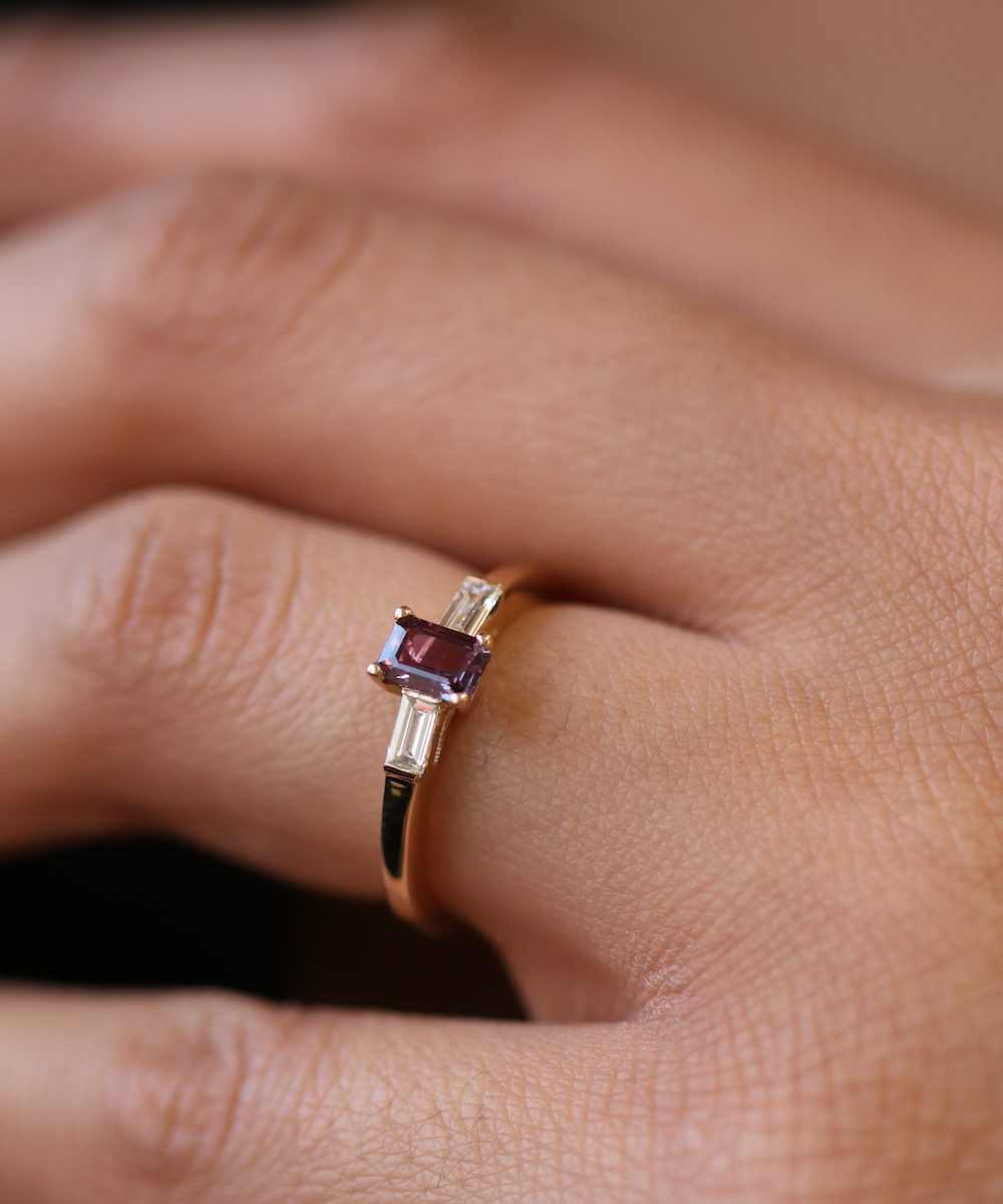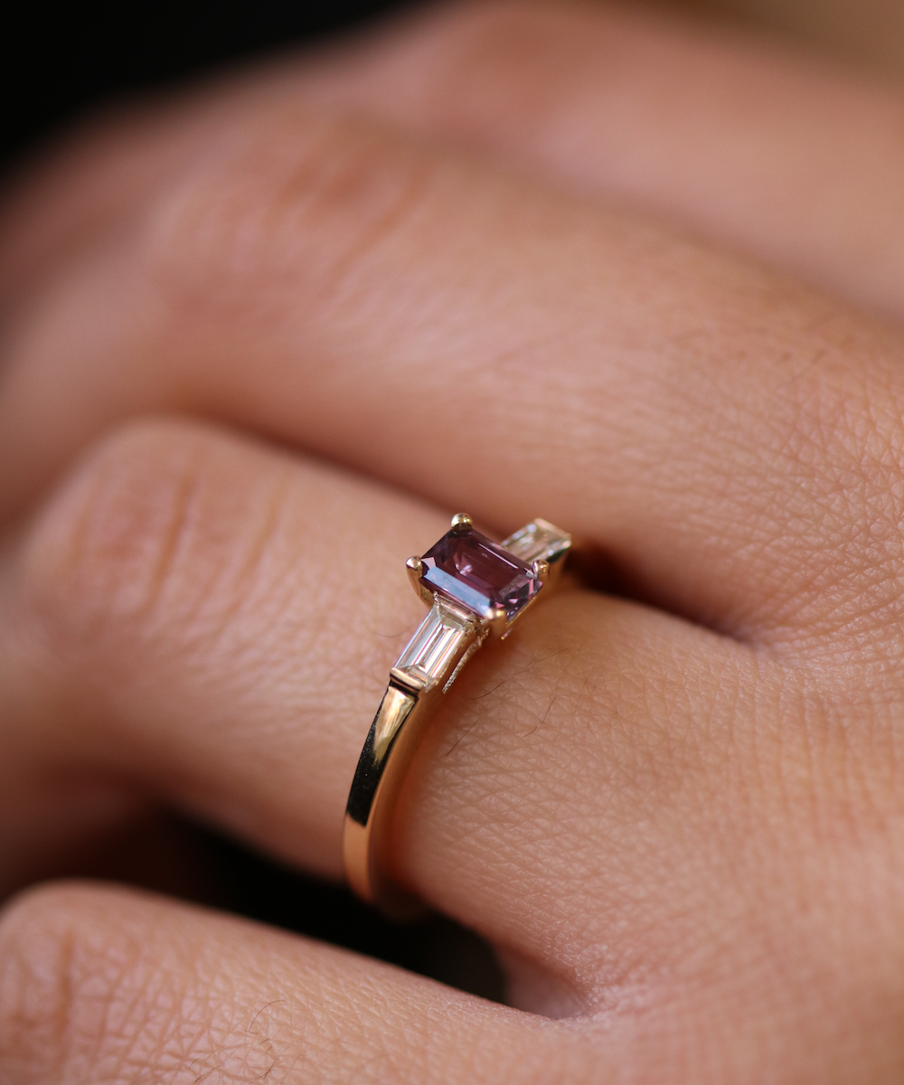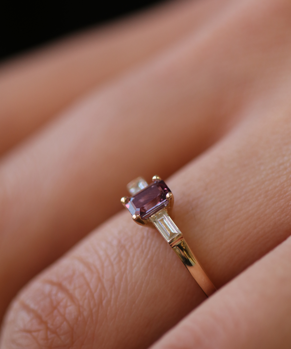 Specifications: Approx 0.75ct emerald cut purple sapphire (6x4mm), approx 0.2ct reclaimed VS white baguette diamonds, 14k gold. 1.5mm band.