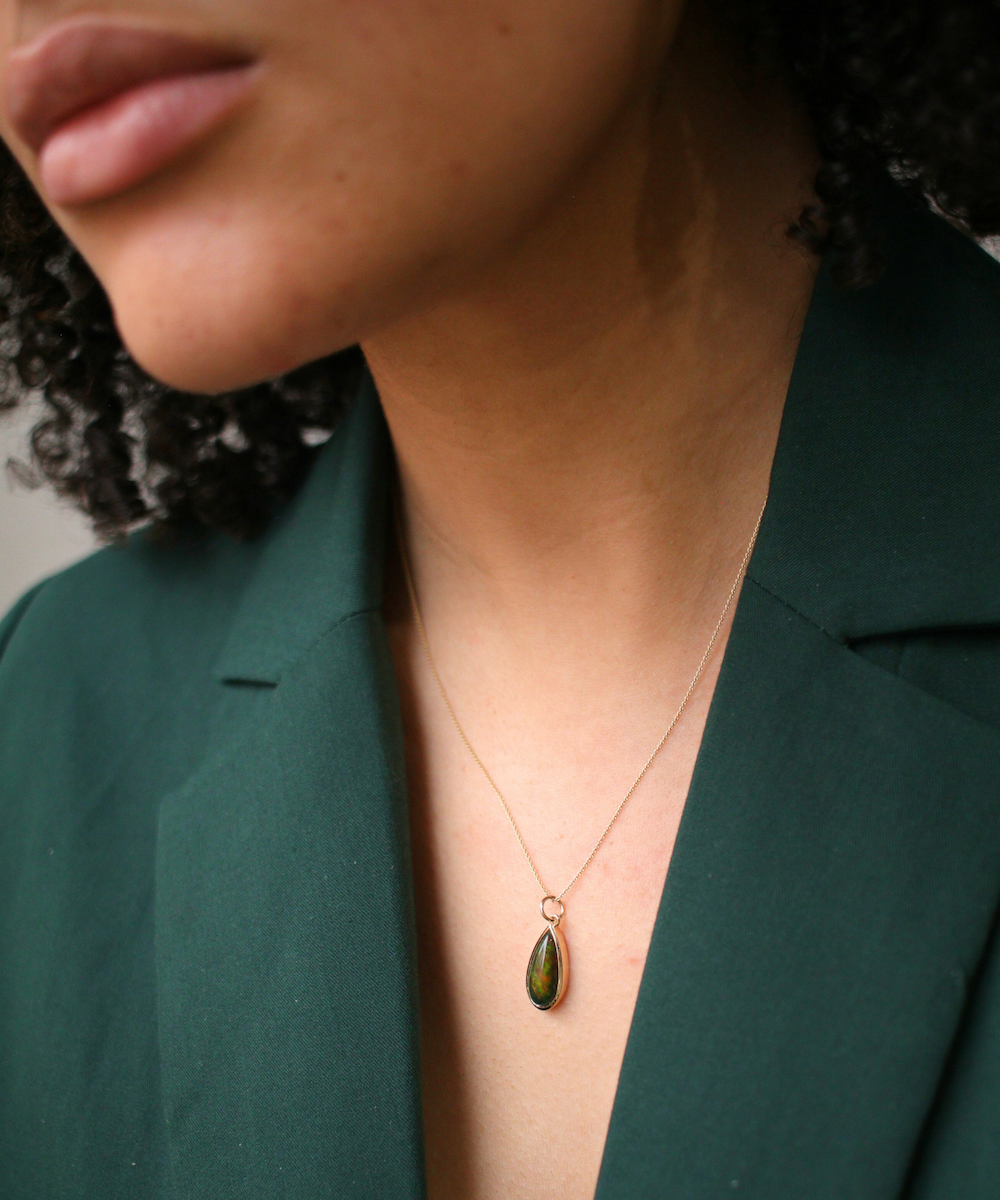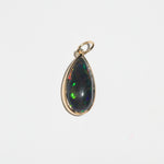 Dark crystal opal pendant in 14k yellow gold setting. The pendant can be easily affixed to most chains.
