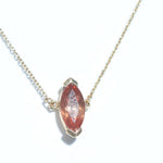 A bi-color marquise cut sunstone which is cut to display a change from green through dusty pink, on a 14k gold setting.