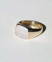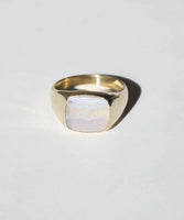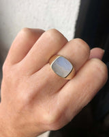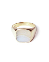 A traditional, square-shaped signet ring with blue agate stone. Each stone is chosen for its own particular qualities and cut by hand, therefore every piece is unique.