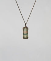 Tourmaline pendant in a custom made setting. Tourmaline has a unique pastel ground with green stripe and peach panel. Large jump ring so the pendant can be easily affixed to most chains.