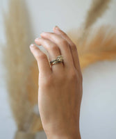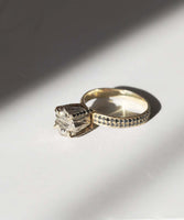 The Rockwell II is modern alternative to the traditional solitaire ring, and is becoming a classic. A solid gold rock replaces a gem, in a custom made setting. This piece was infused with tiny black diamonds, with as much defiance as before. Each piece is custom made at the New York studio.