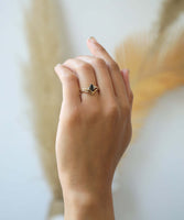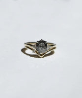 Salt and Pepper Diamond engagement ring and V shaped 14k yellow gold band with tiny white diamond macha studio brooklyn new york