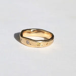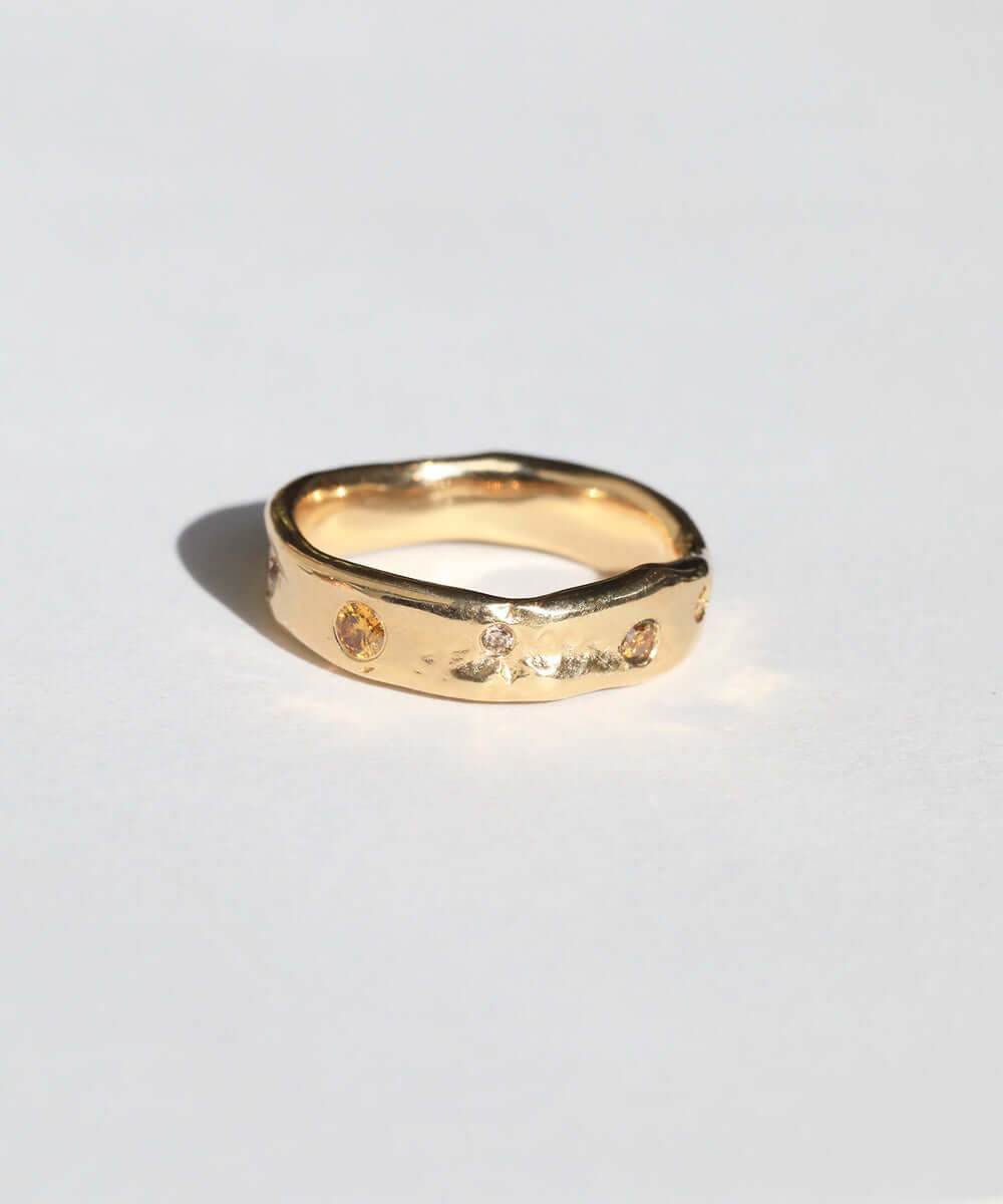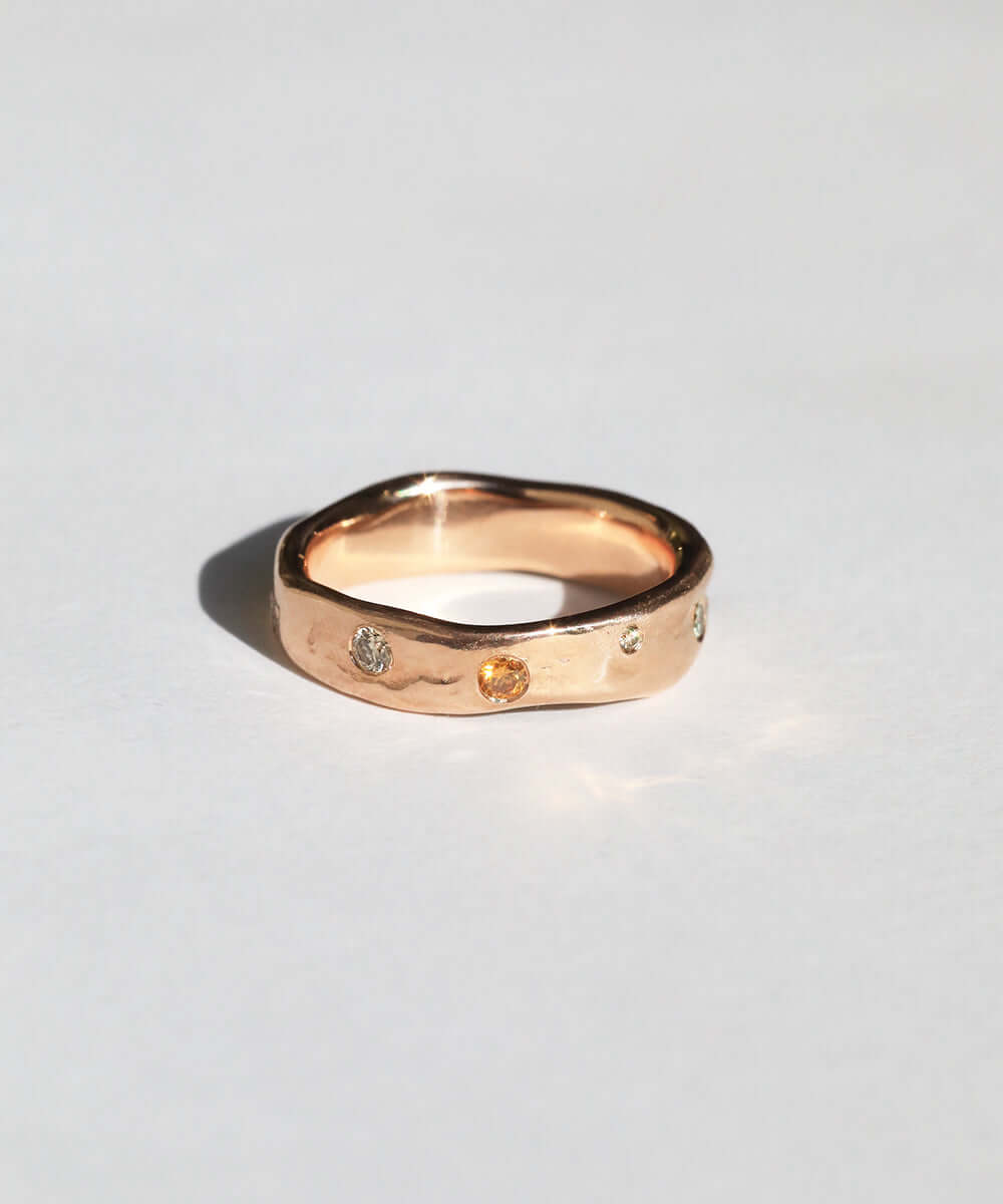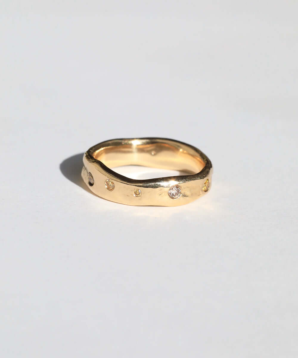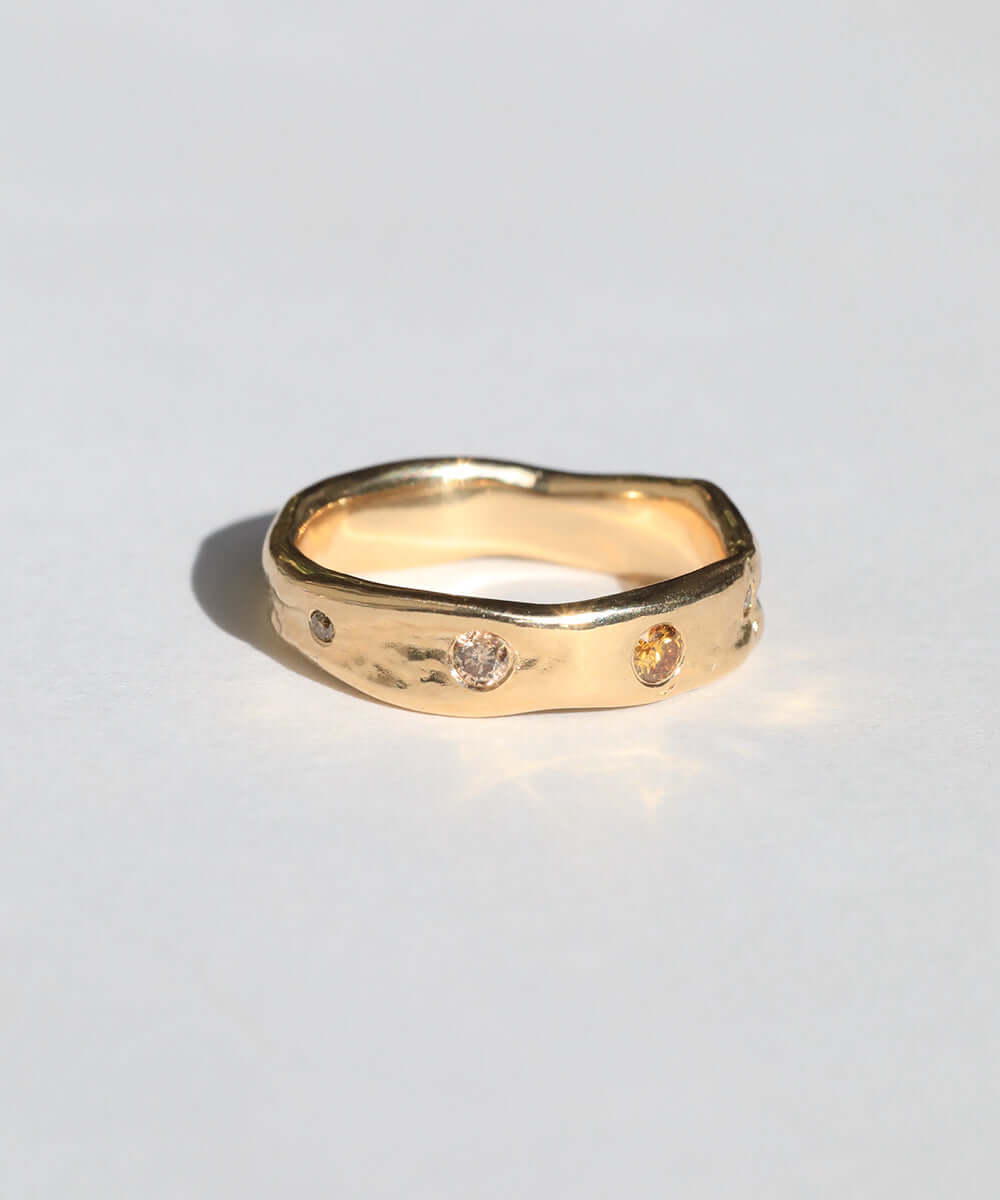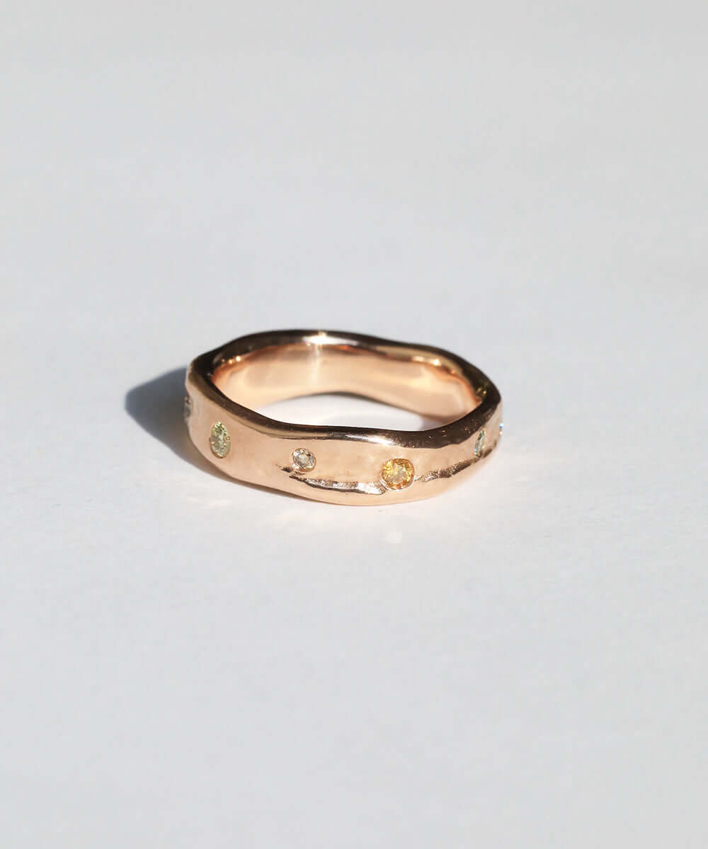 A natural, uneven band inspired by organic forms and crafted in gold. Infused with multi-colored diamonds.