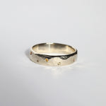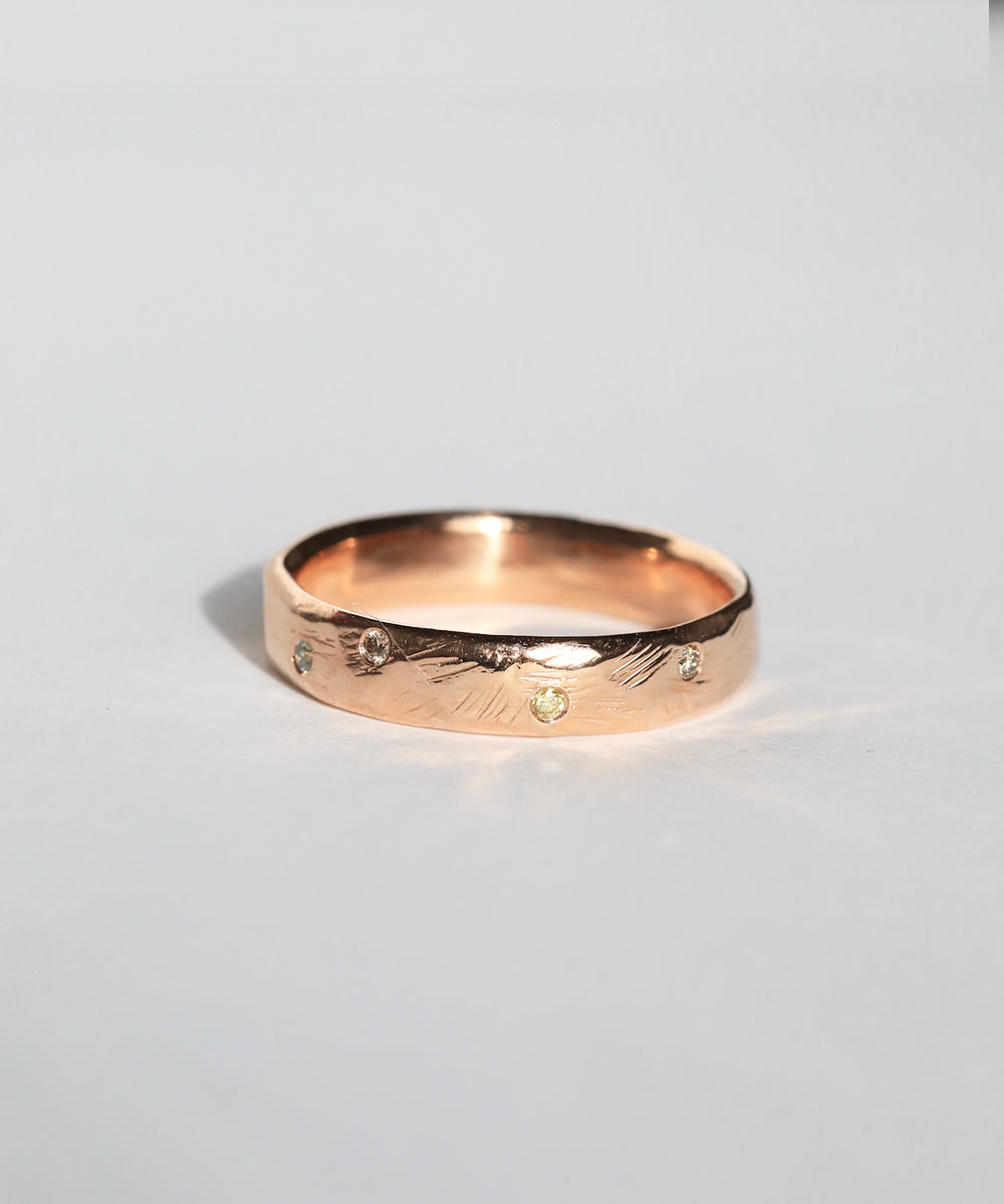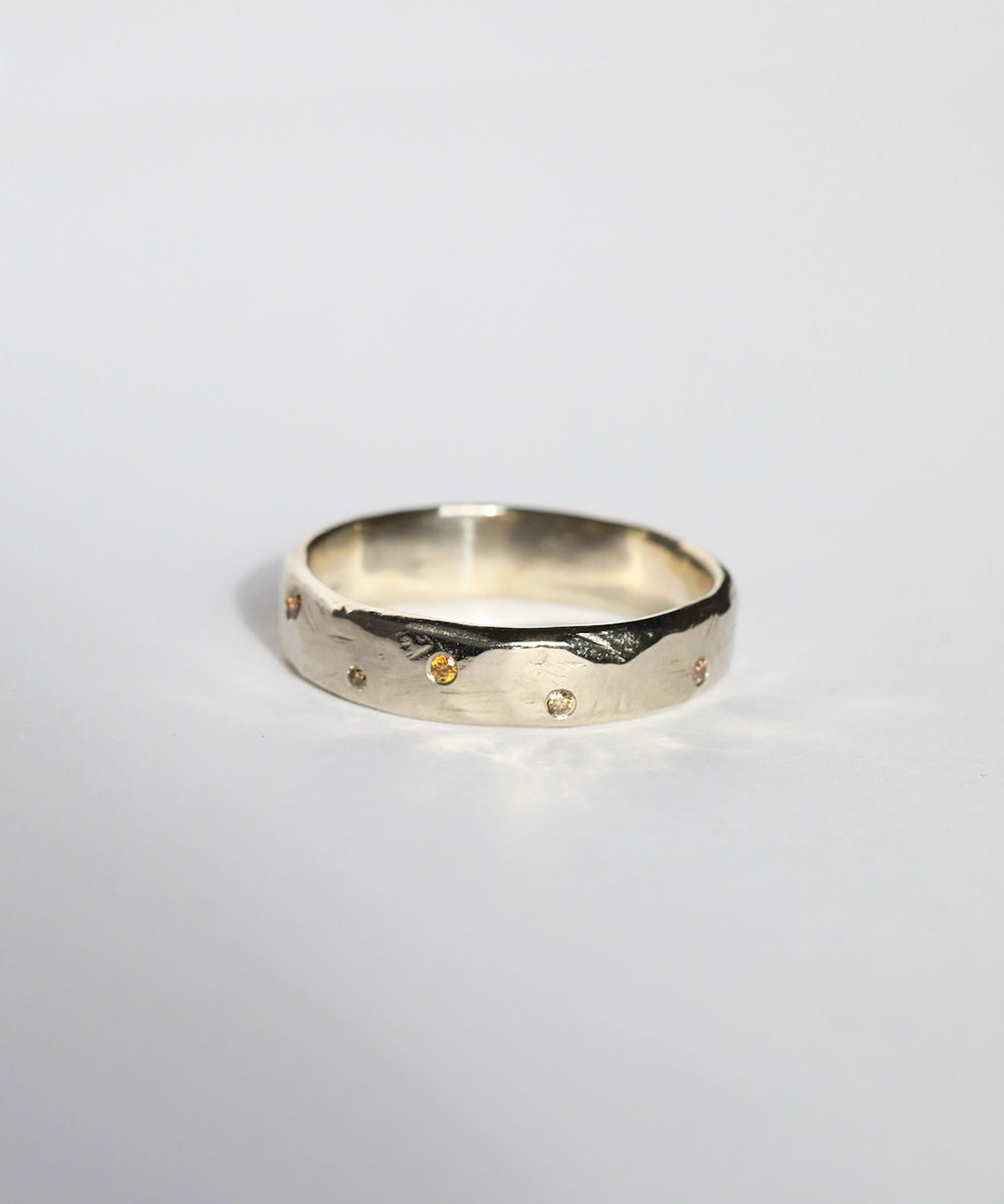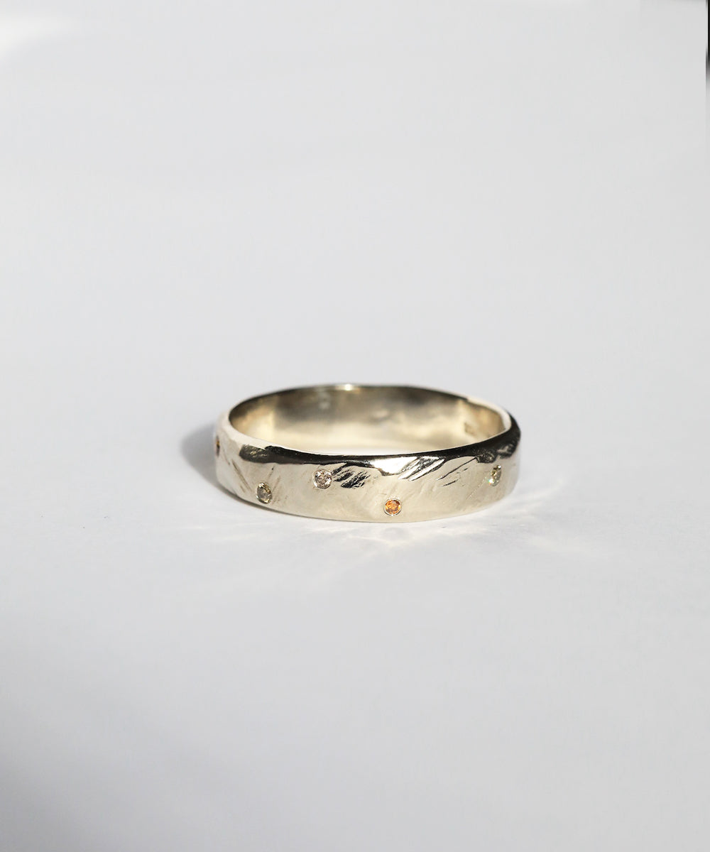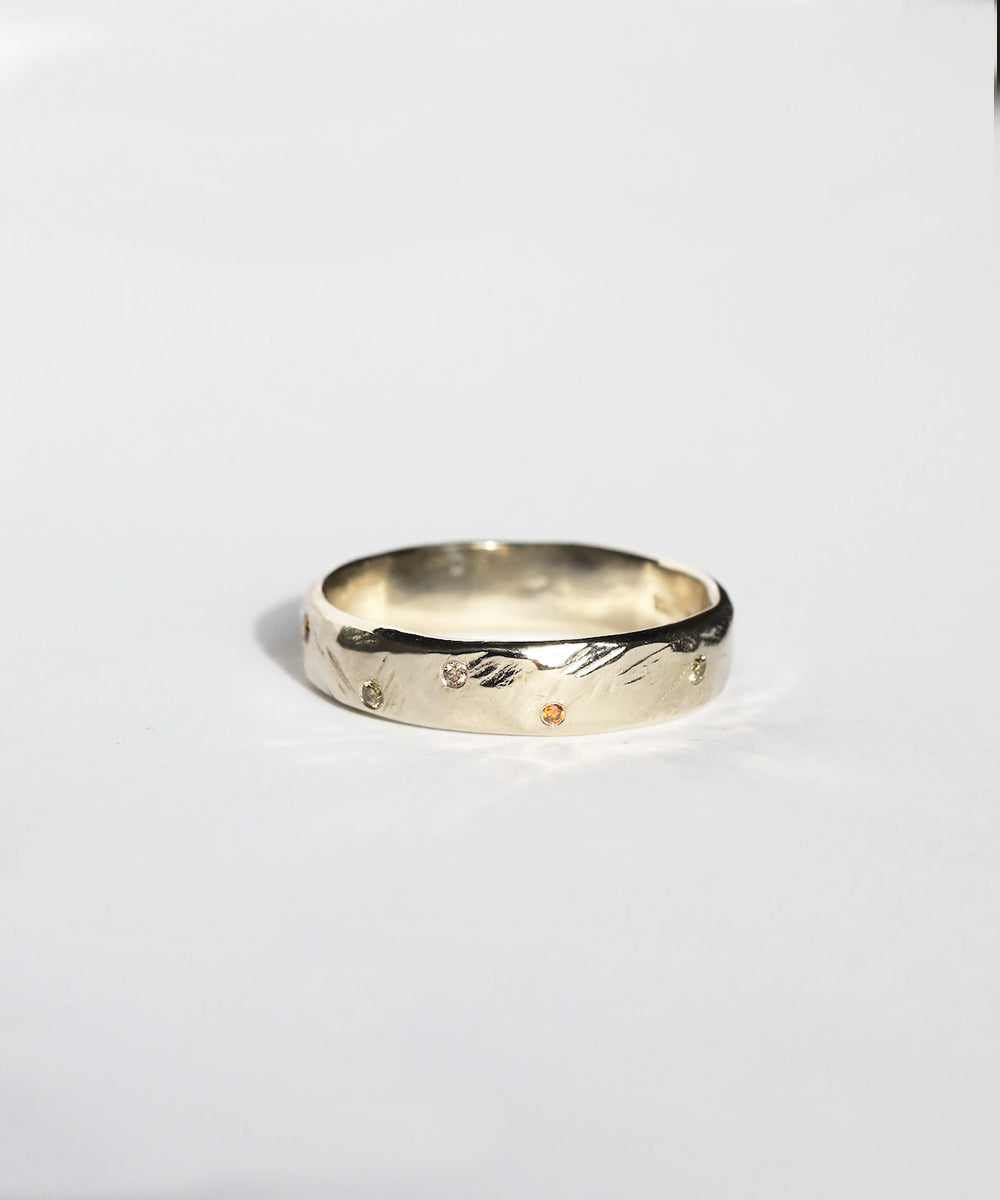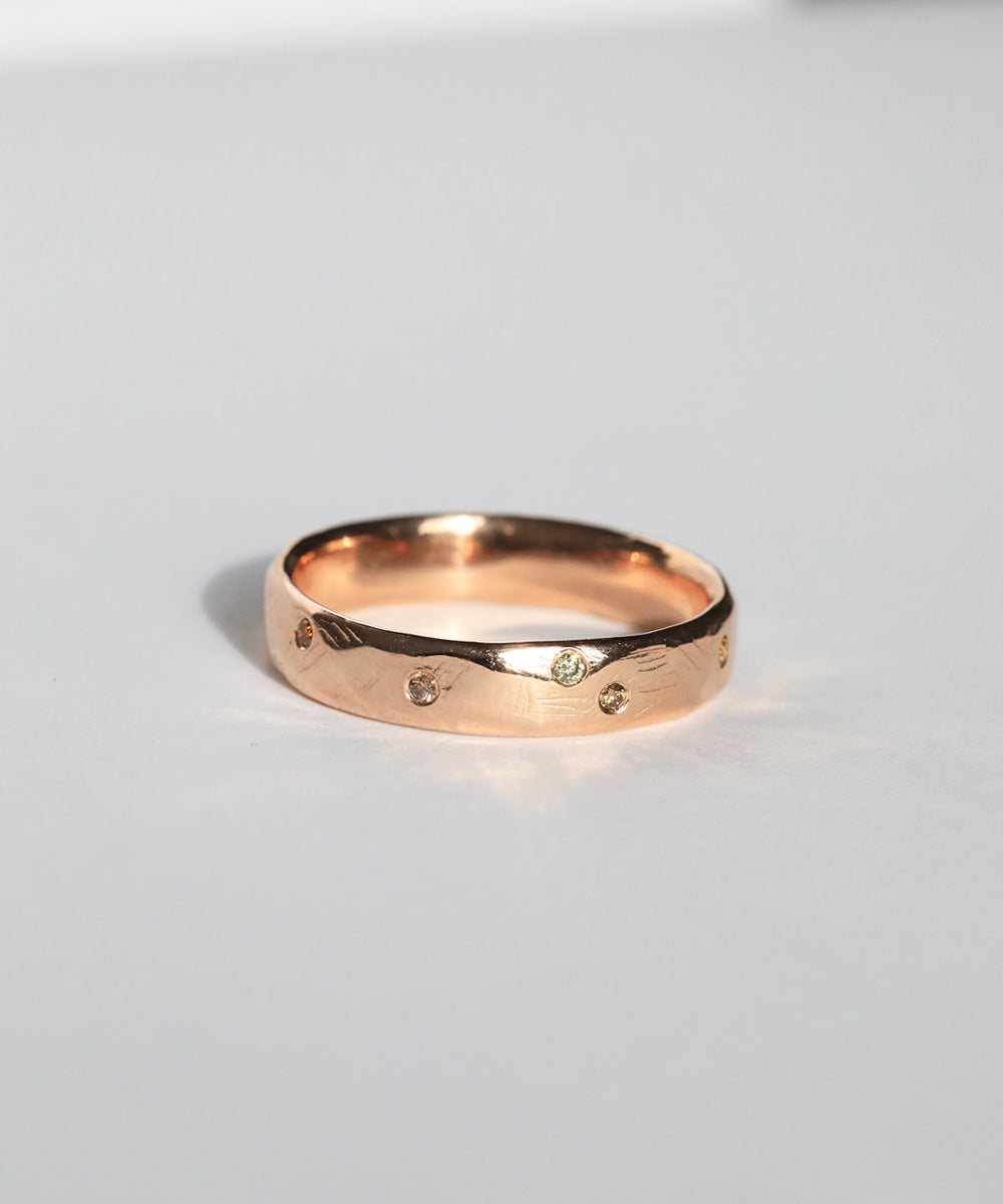 Specifications: 14k recycled gold. Approx. 6mm width. With ten 1.5mm multi-colored natural diamonds, orange, cognac, yellow & gray.