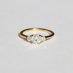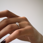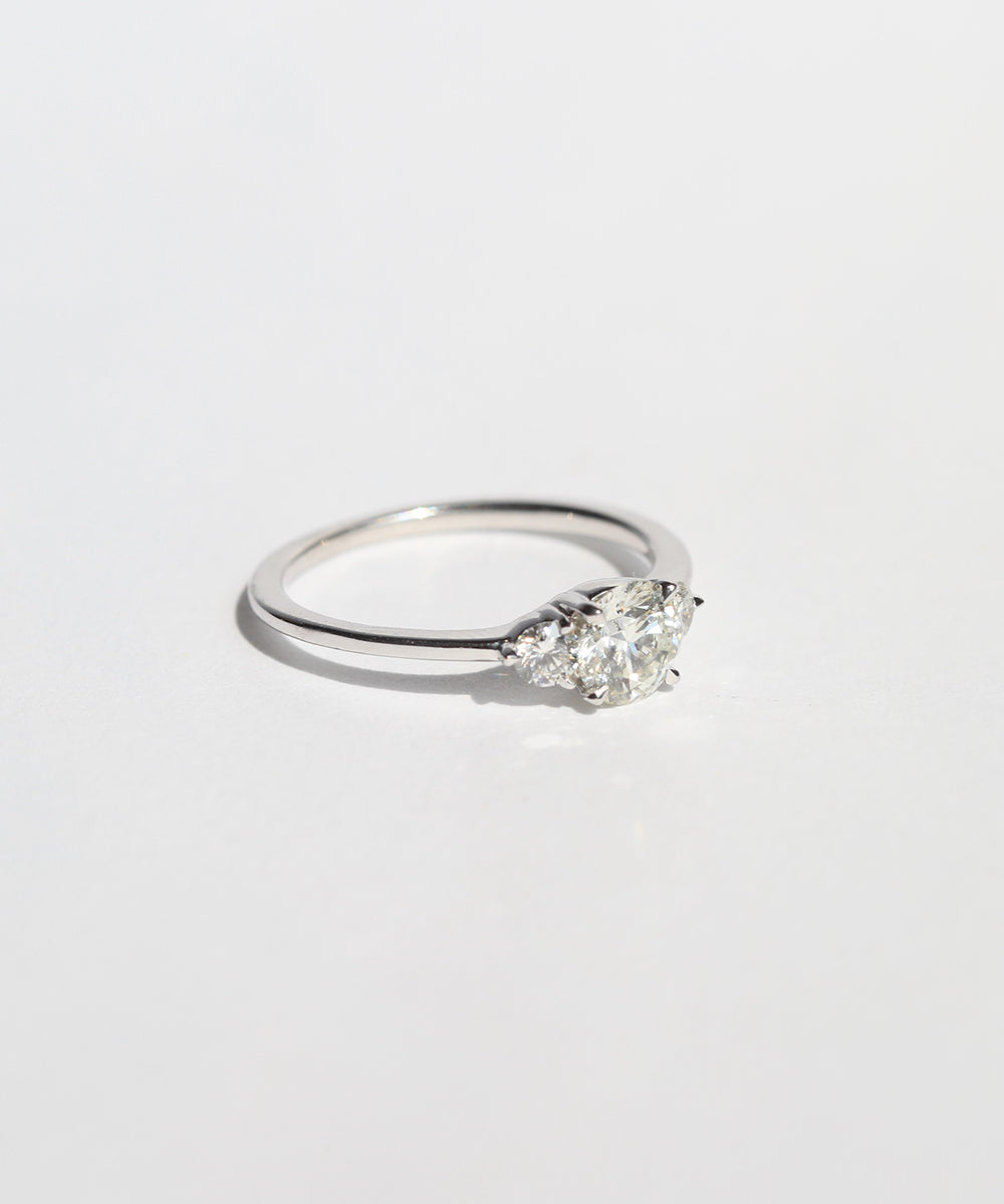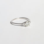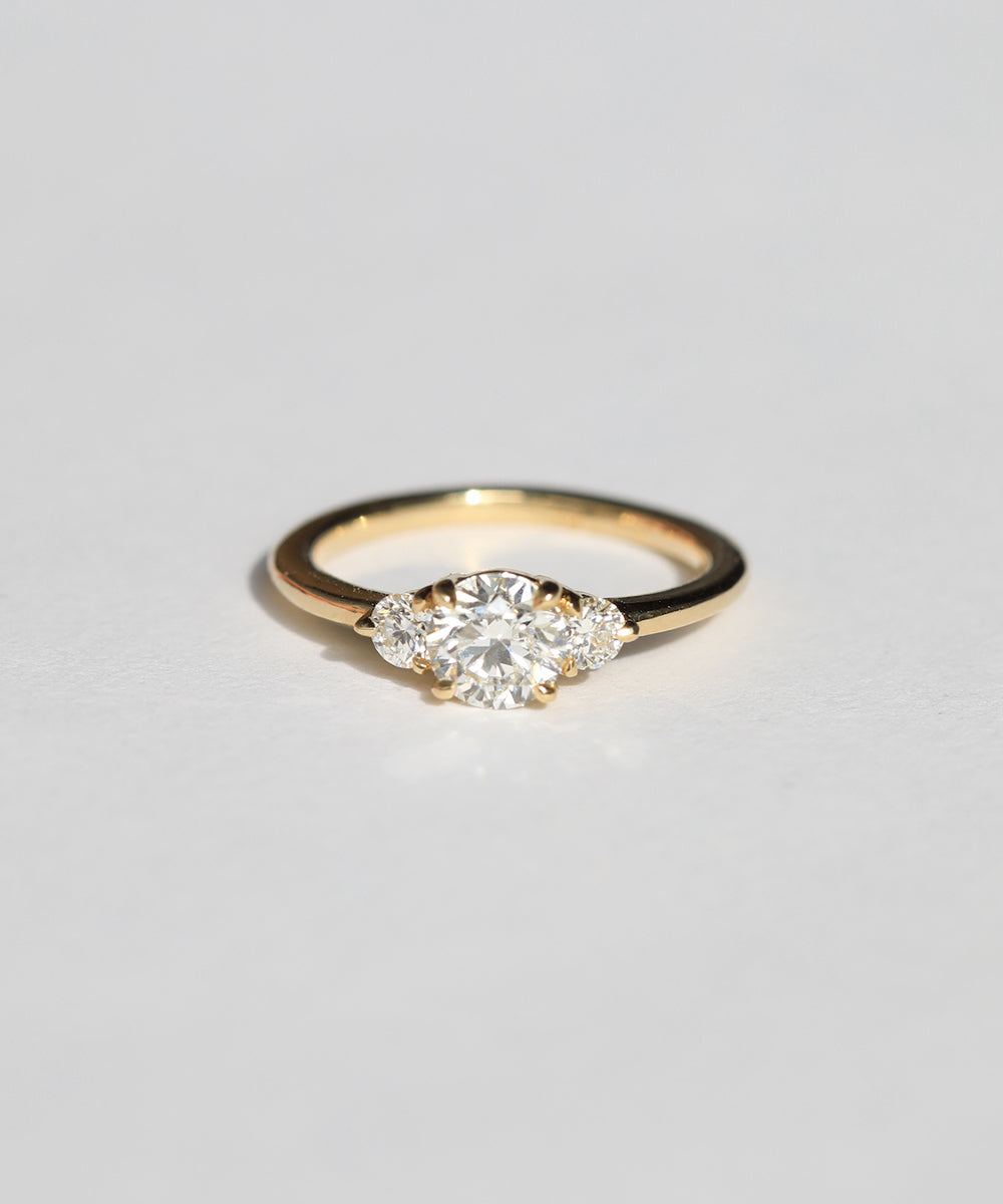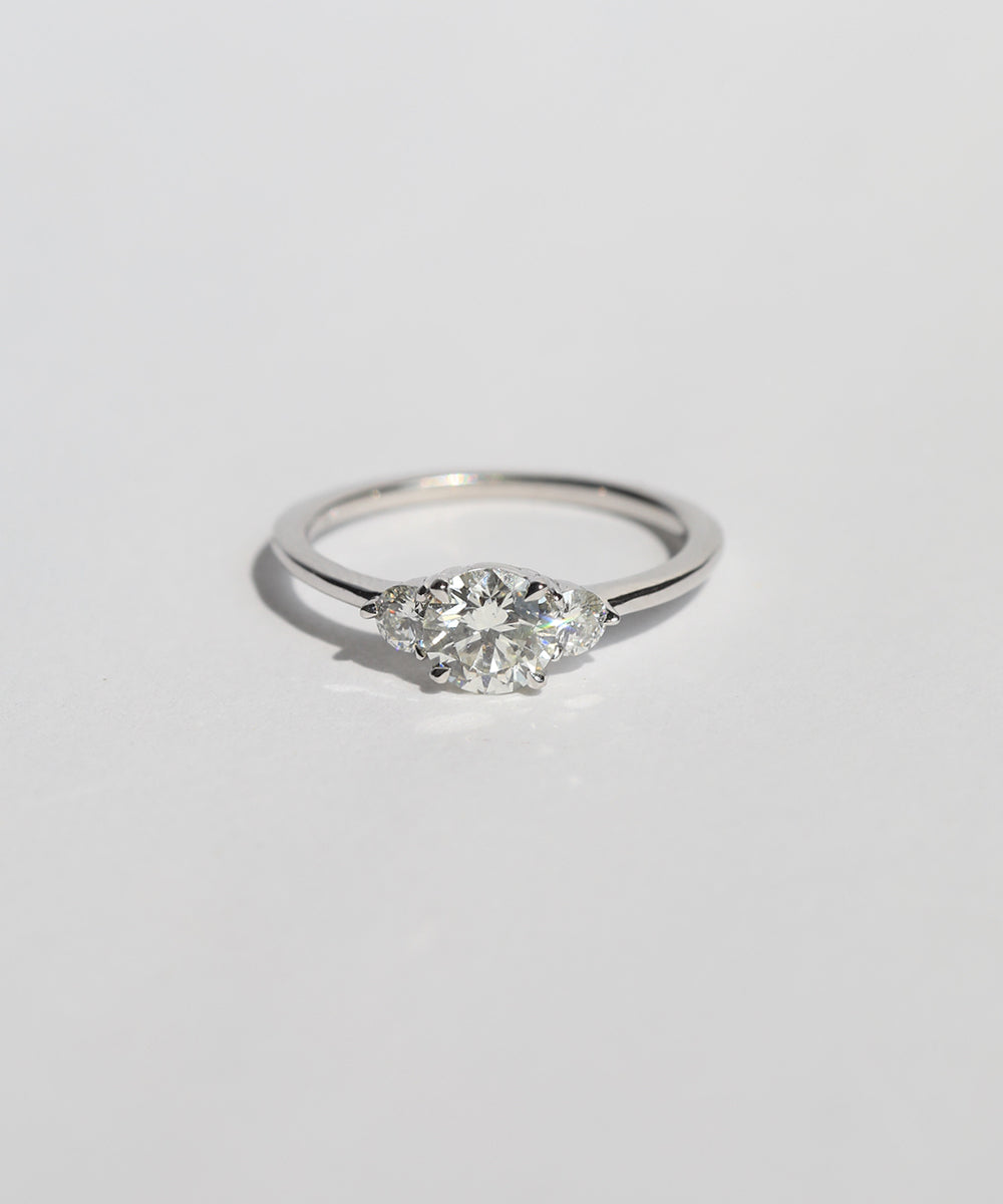This three stone engagement ring has a round cut white diamond, highlighted by two round accent diamonds on either side. Sits low to the finger.