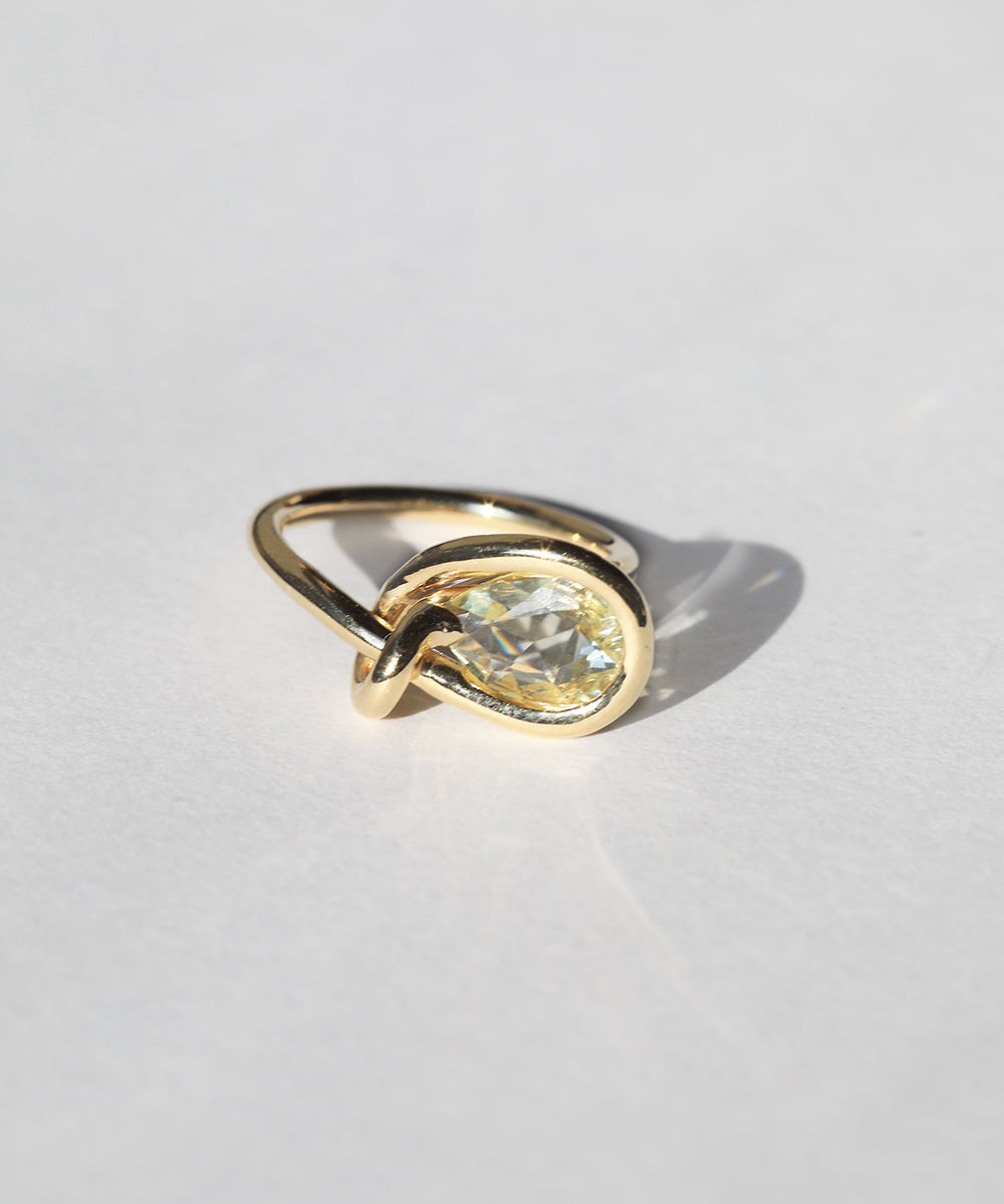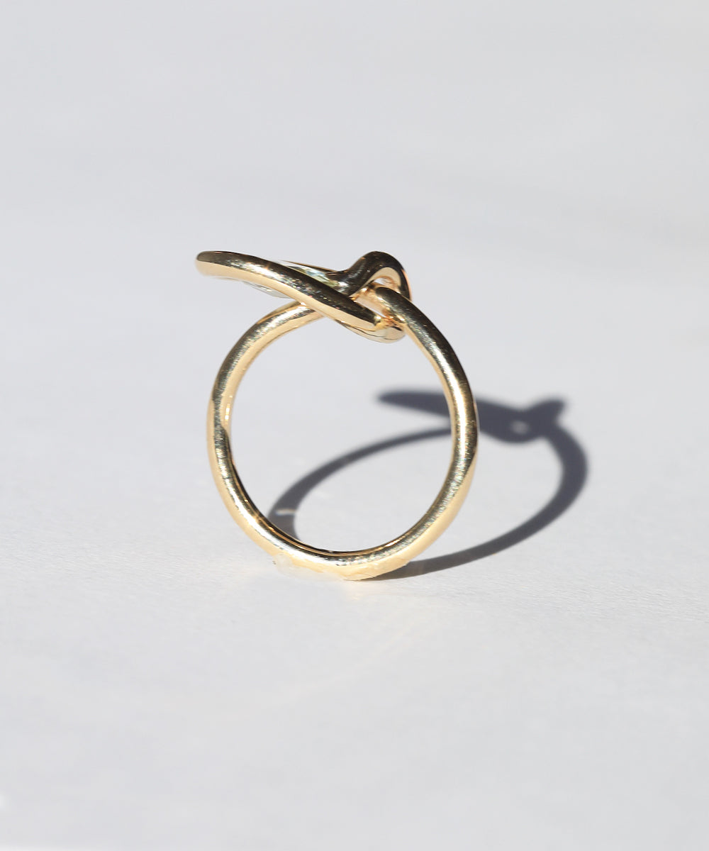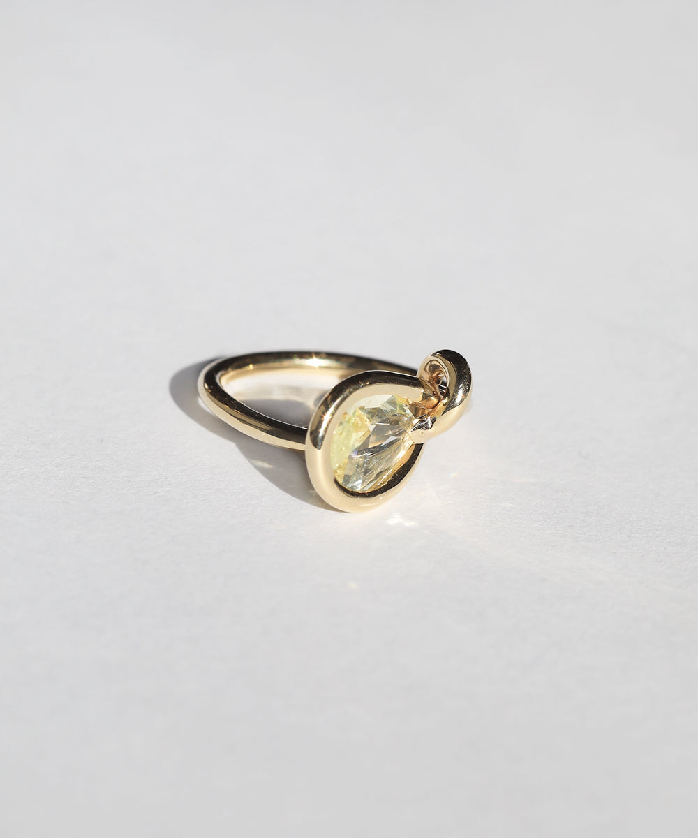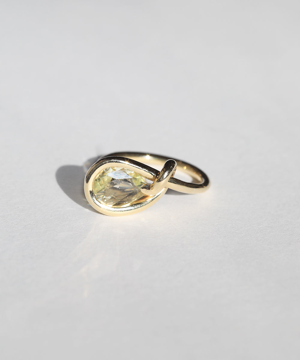A loose knot formed into a sculptural ring. Gold gently curves around a freeform suspended sapphire