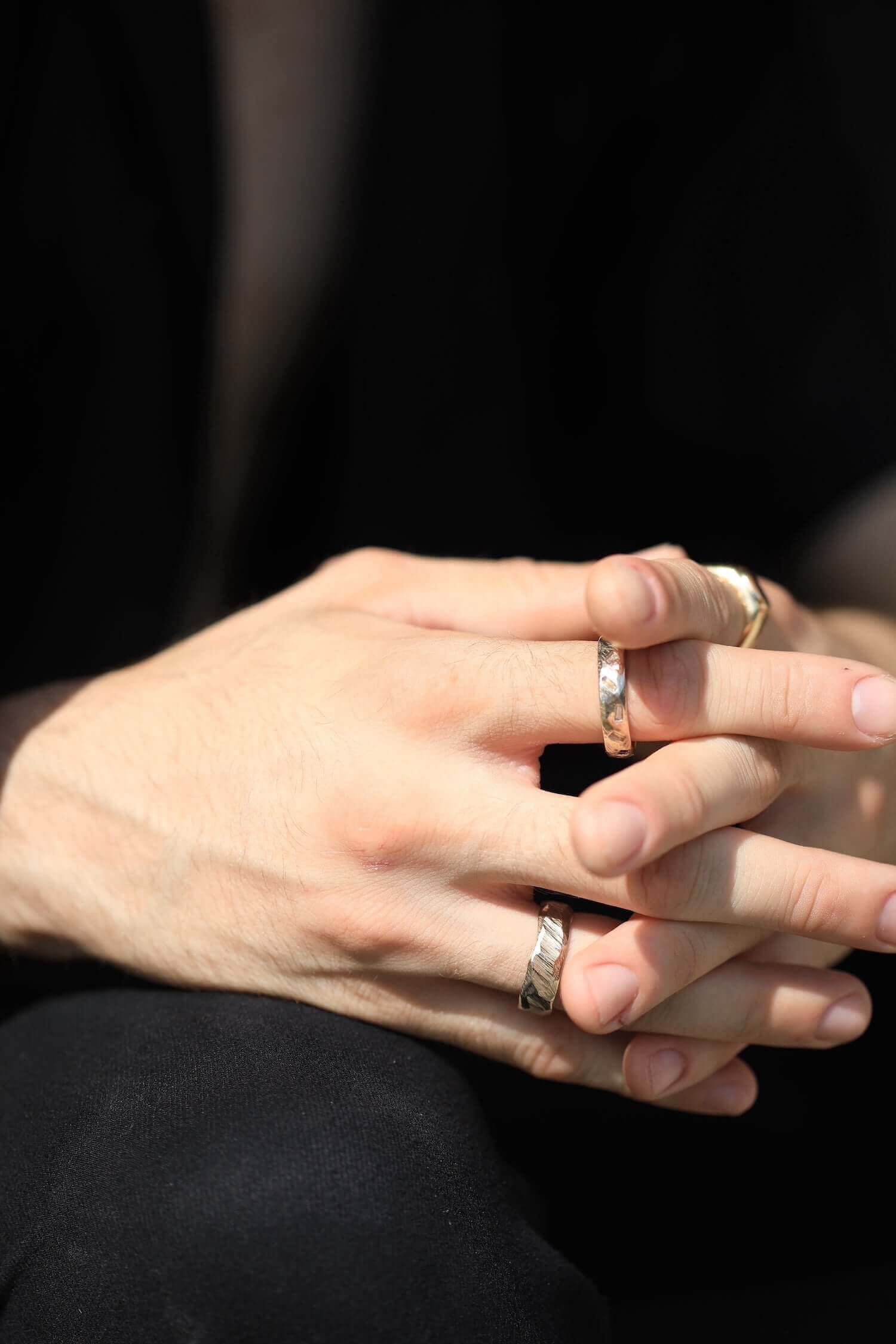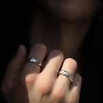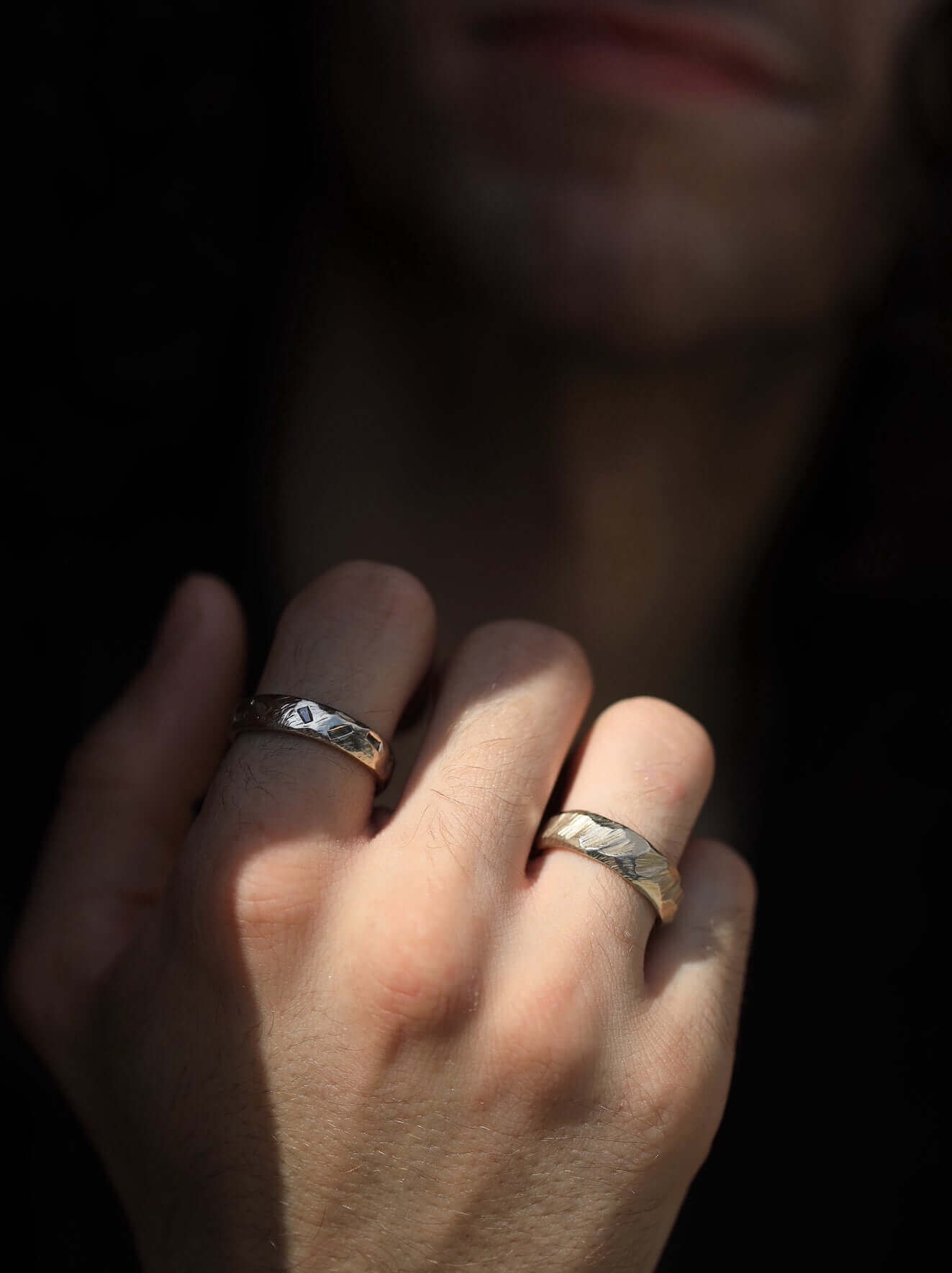 The Ragged Series are organic versions of traditional wedding bands. The texture, originally created by accident, is carved on each ring individually so no two rings are ever the same