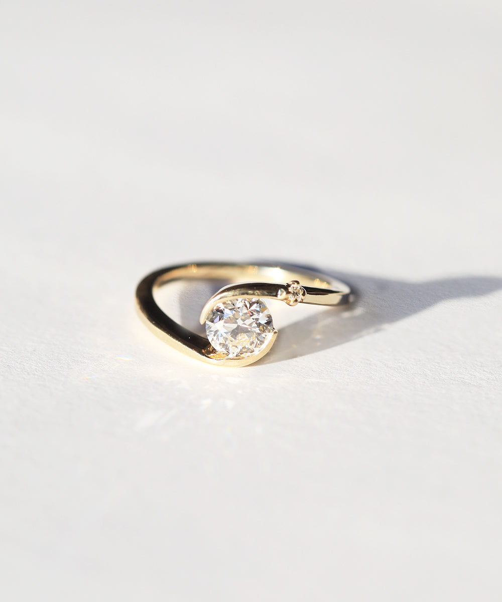 A sculptural twisted band with reclaimed natural white diamond and tiny diamond accent.