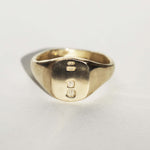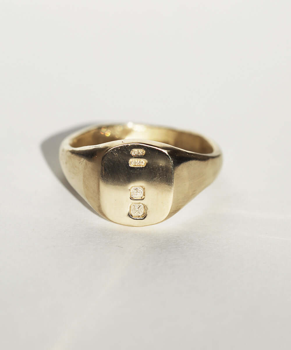Limited Edition classic small square signet ring in gold with British hallmarks. The crown representing solid gold.