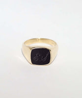 Specifications: 14k gold, 10mm square black onyx, 3mm at back of ring. Two letters engraved. Please contact us regarding other metal colors, or rush orders. For engraving you can leave a note when checking out, 2 characters maximum.