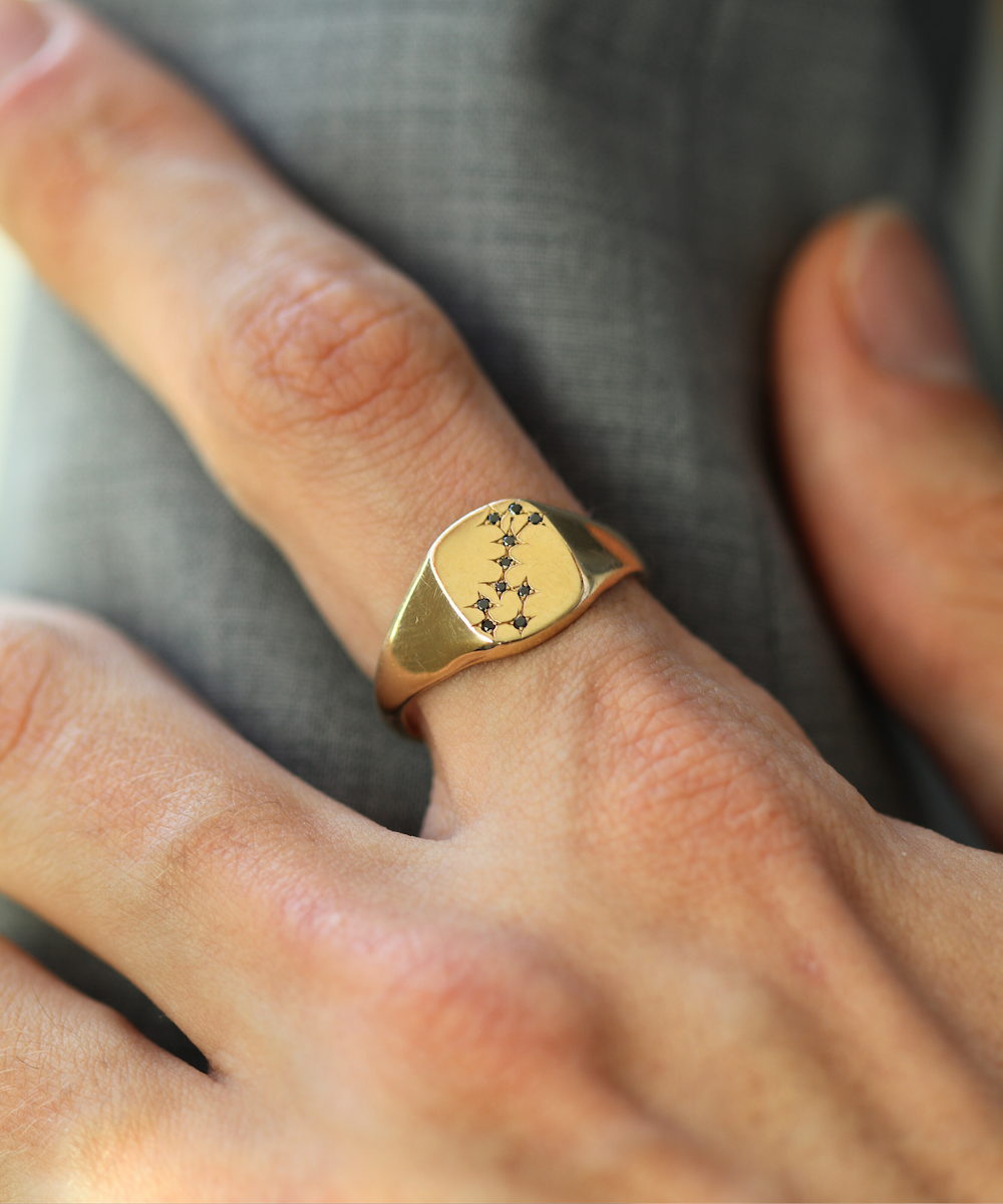 Our traditional small signet ring with a constellation of black diamonds & engraving. Pictured is our Aries, Libra, Cancer, Capricorn, Scorpio & Sagittarius motif.