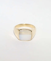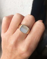 This is a traditional, square-shaped signet ring with white agate stone. Each stone is chosen for its own particular qualities and cut by hand, therefore every piece is unique. Agate is said to promote inner stability, composure, and maturity. Its warm protective properties encourage security and self-confidence.